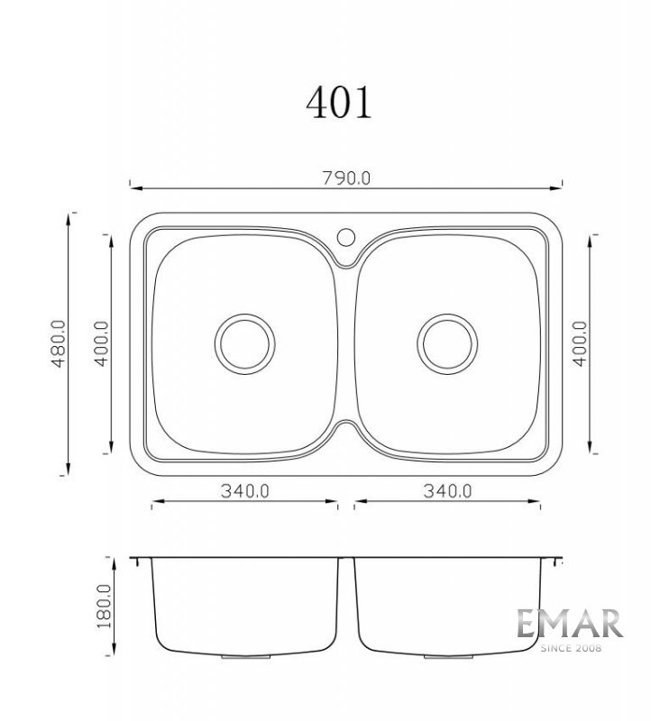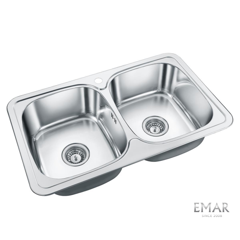 Классическая двухчашевая мойка из нержавеющей стали AISI 201 с глянцевой поверхностью. На дне установлена резиновая шумопоглощающая накладка.