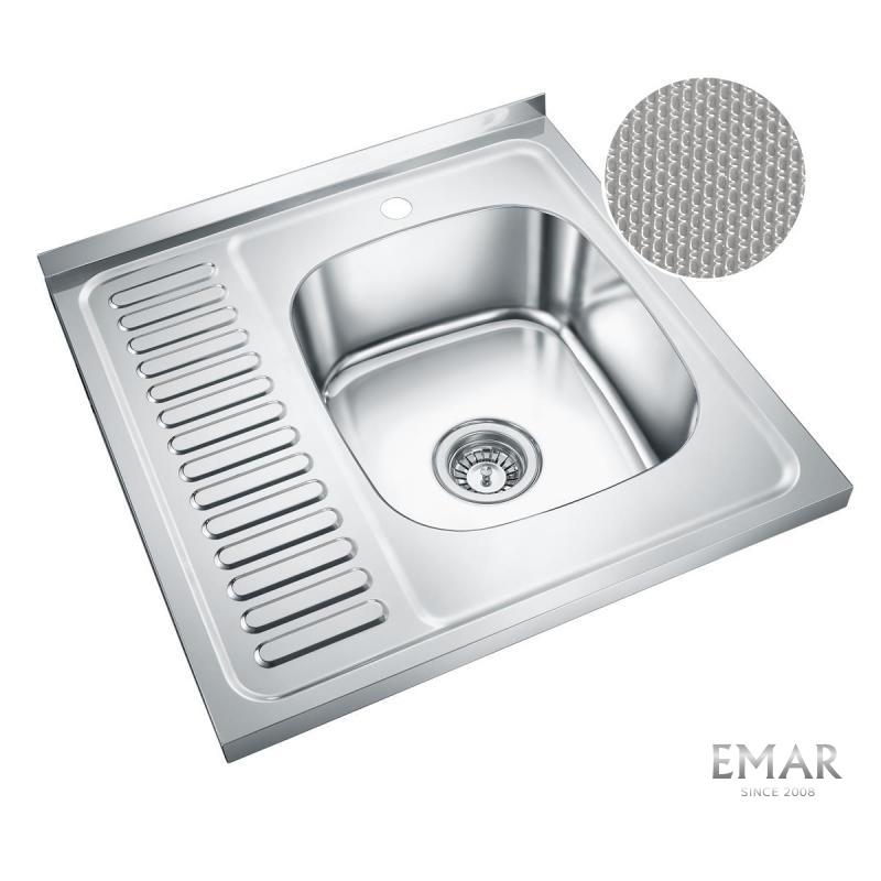 Классическая накладная мойка c крылом из нержавеющей стали AISI 201. Поверхность мойки указана в вариантах товара. Чаша расположена справа от крыла. Данная модель при монтаже накладывается на отдельностоящую тумбу. На дне установлена резиновая шумопоглощающая накладка.
