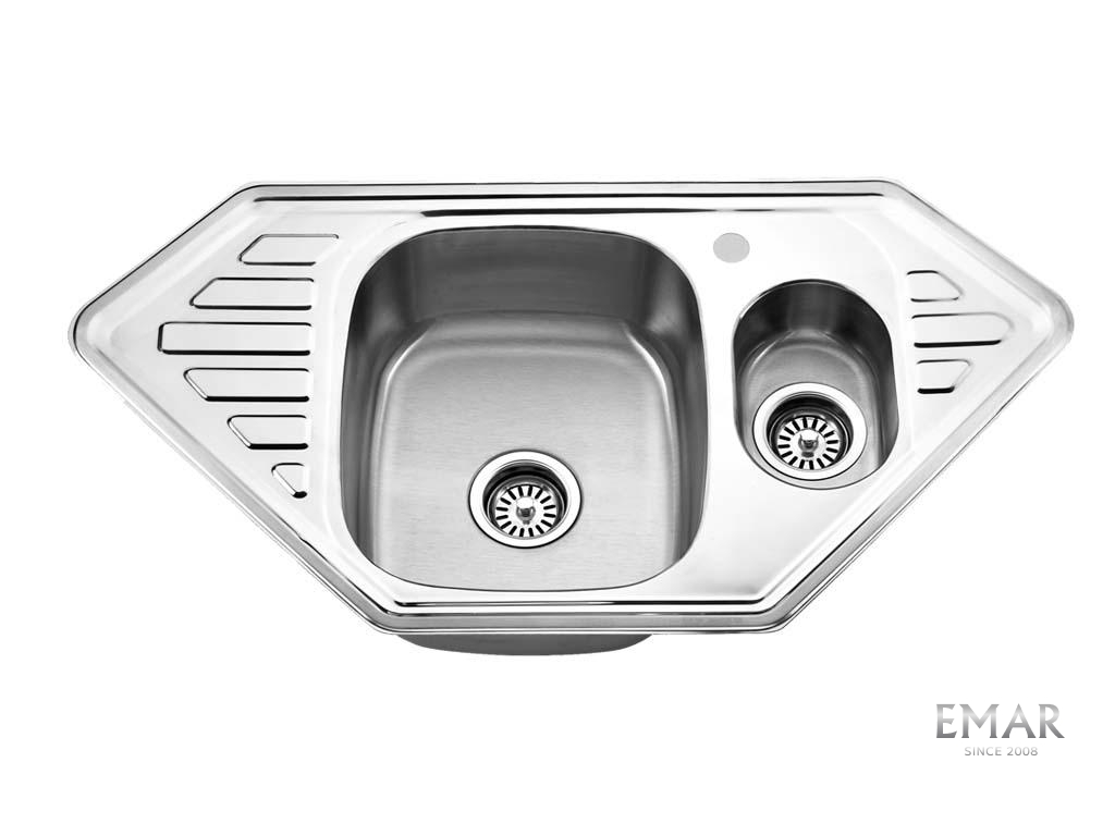 Трапециевидная мойка с двумя чашами из нержавеющей стали AISI 201 с глянцевой поверхностью. Данная модель предназначена для монтажа в угол. На дне установлена резиновая шумопоглощающая накладка.