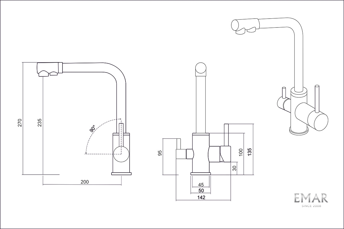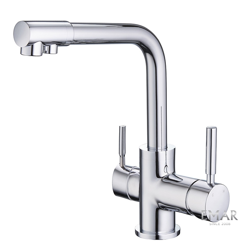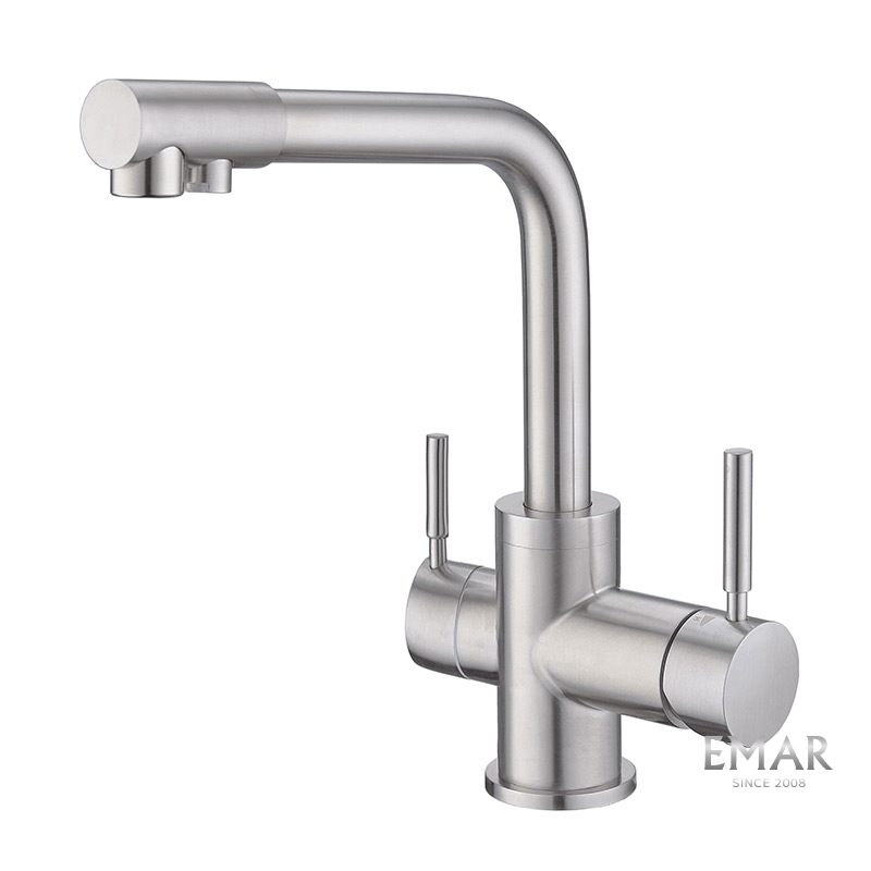 Кухонный смеситель с возможностью подключения фильтра для очистки воды. Фильтрованная вода подается отдельной ручкой через отдельную трубку и не смешивается с водопроводной водой. Однорычажное управление поможет легко регулировать температуру и напор подачи воды. Соответствует стандартам DIN DVGW.