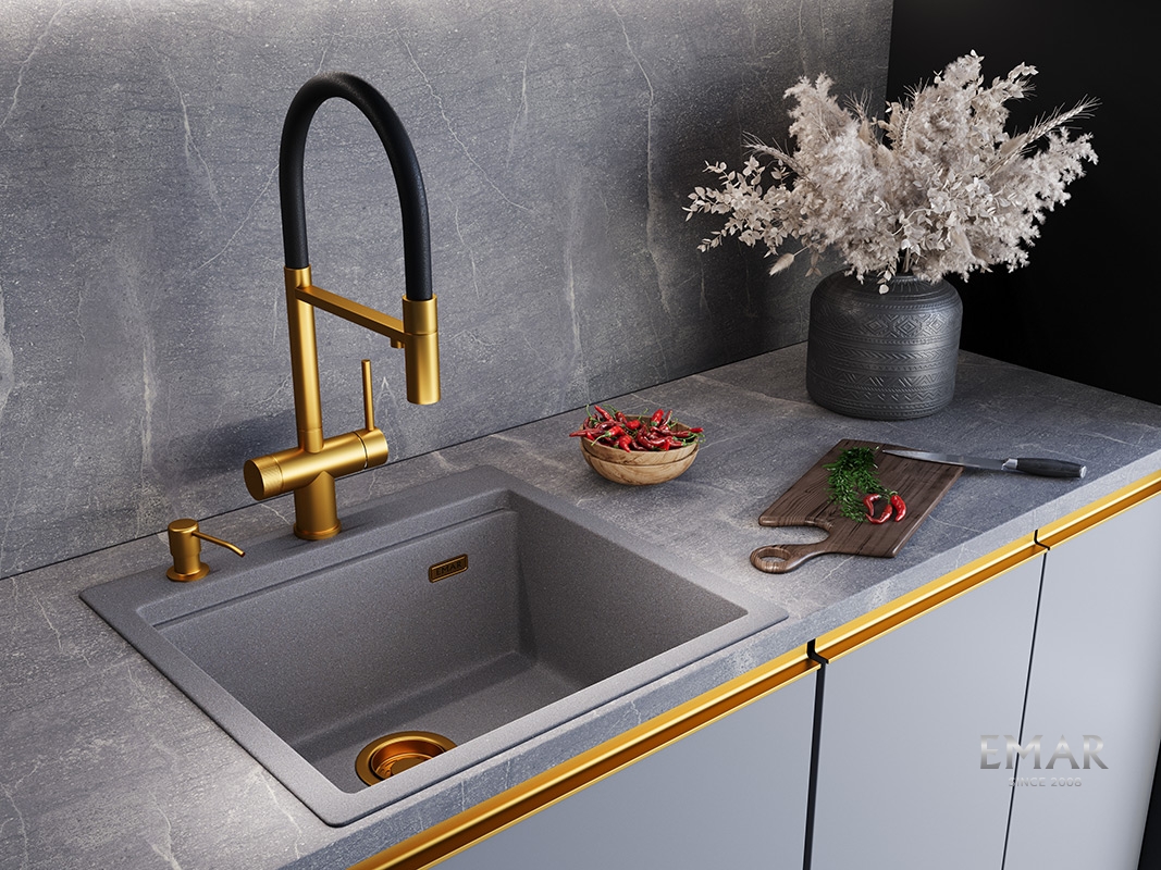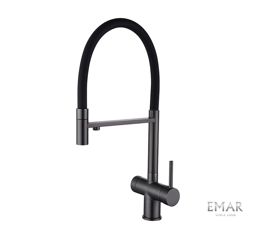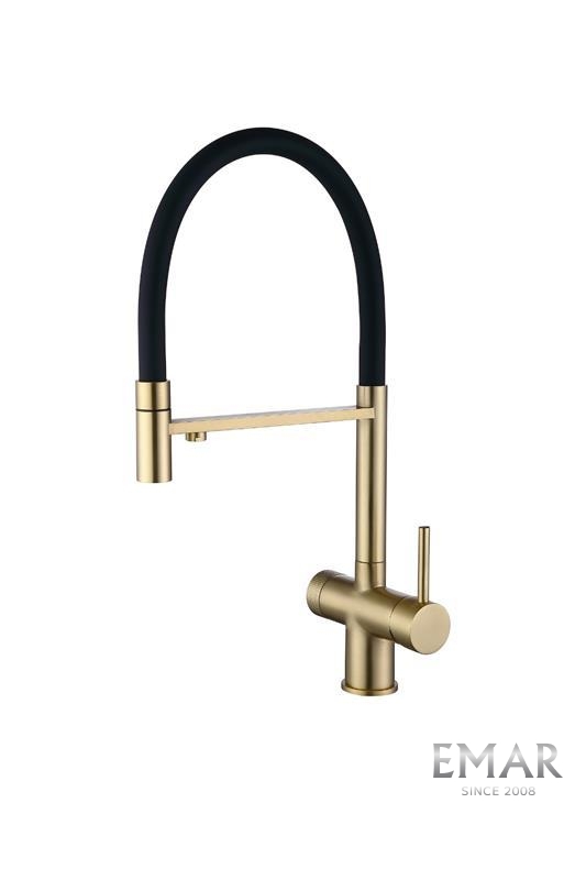 Кухонный смеситель с возможностью подключения фильтра для очистки воды. Фильтрованная вода подается отдельной ручкой через отдельную трубку и не смешивается с водопроводной водой.