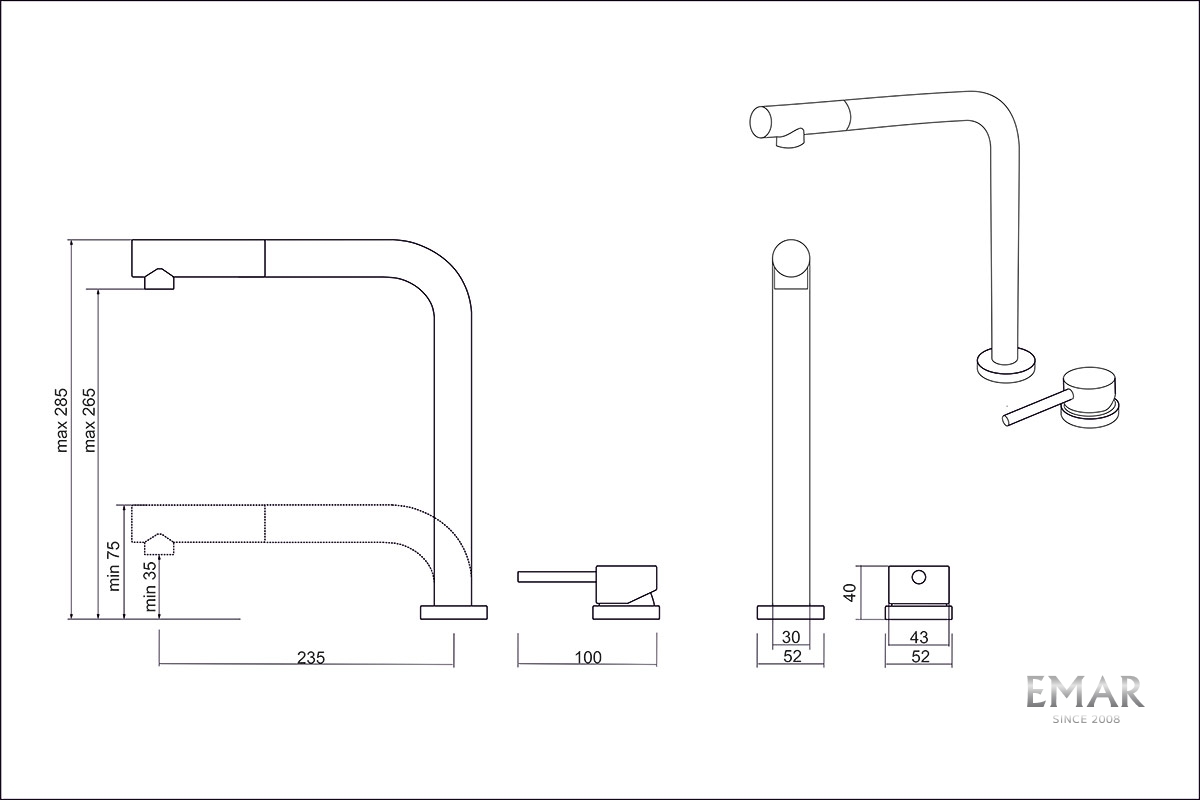 • Высота смесителя: регулируемая (max 285мм / min 75мм)