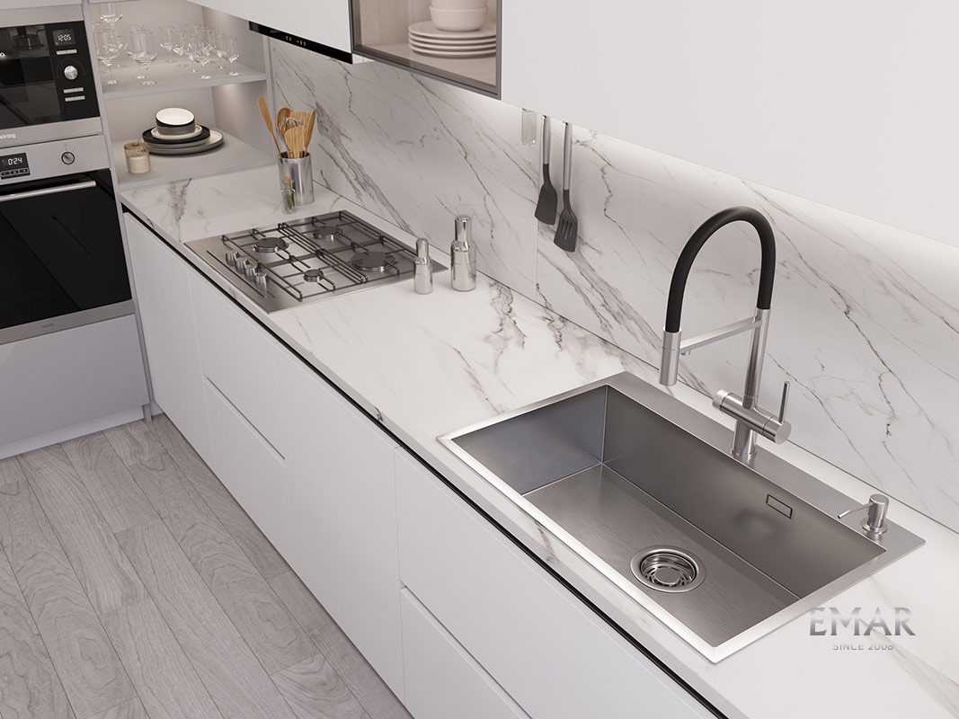 Мойка из нержавеющей стали AISI. AISI 304 содержит 18% хрома и 9% никеля, что обеспечивает максимальную устойчивость к коррозии. PVD покрытие (метод покраски путем напыления в вакууме) встраивается в кристаллическую решетку металла, образуя прочный защитный слой. Легко удаляется жир, налет и разводы от воды.
