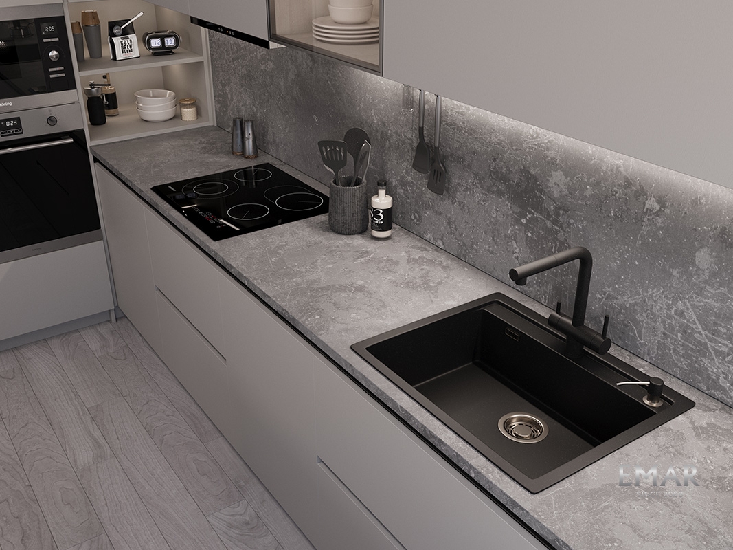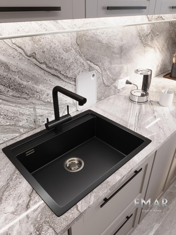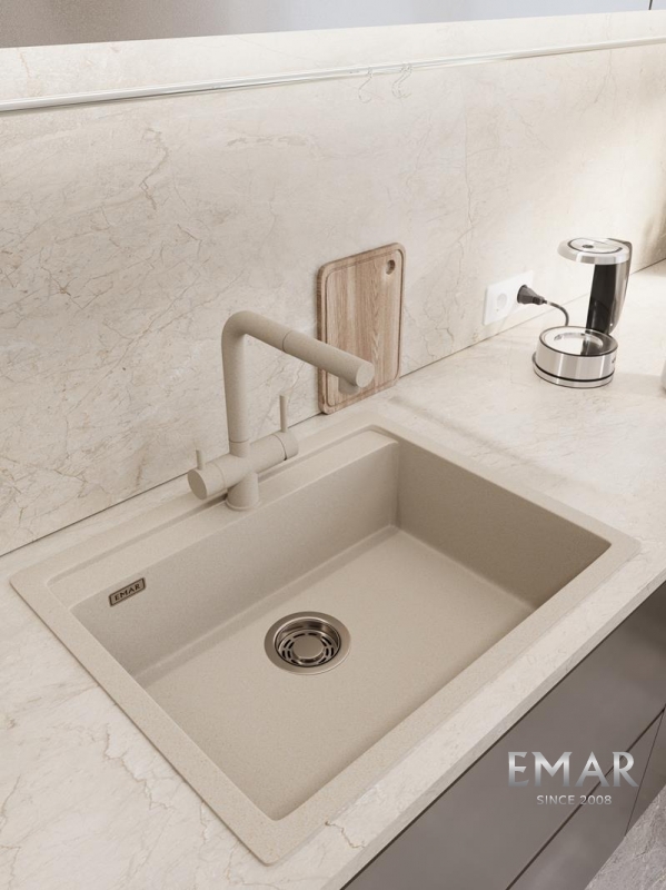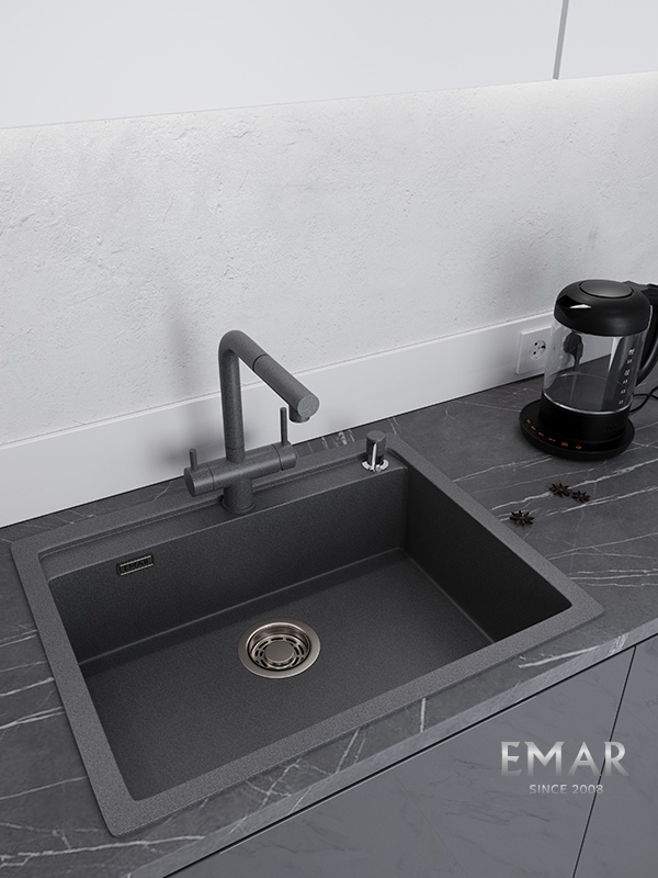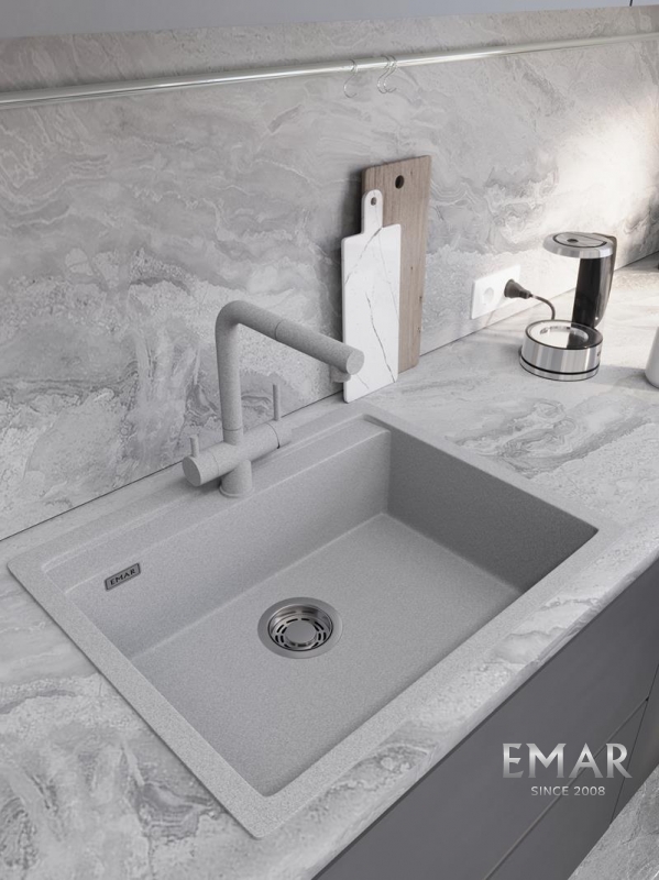 Кухонные мойки EMAR QUARTZ на 78% состоят из измельченного кварца различных фракций и 22% связующих полиэфирных смол модифицированных метилметакрилатом.