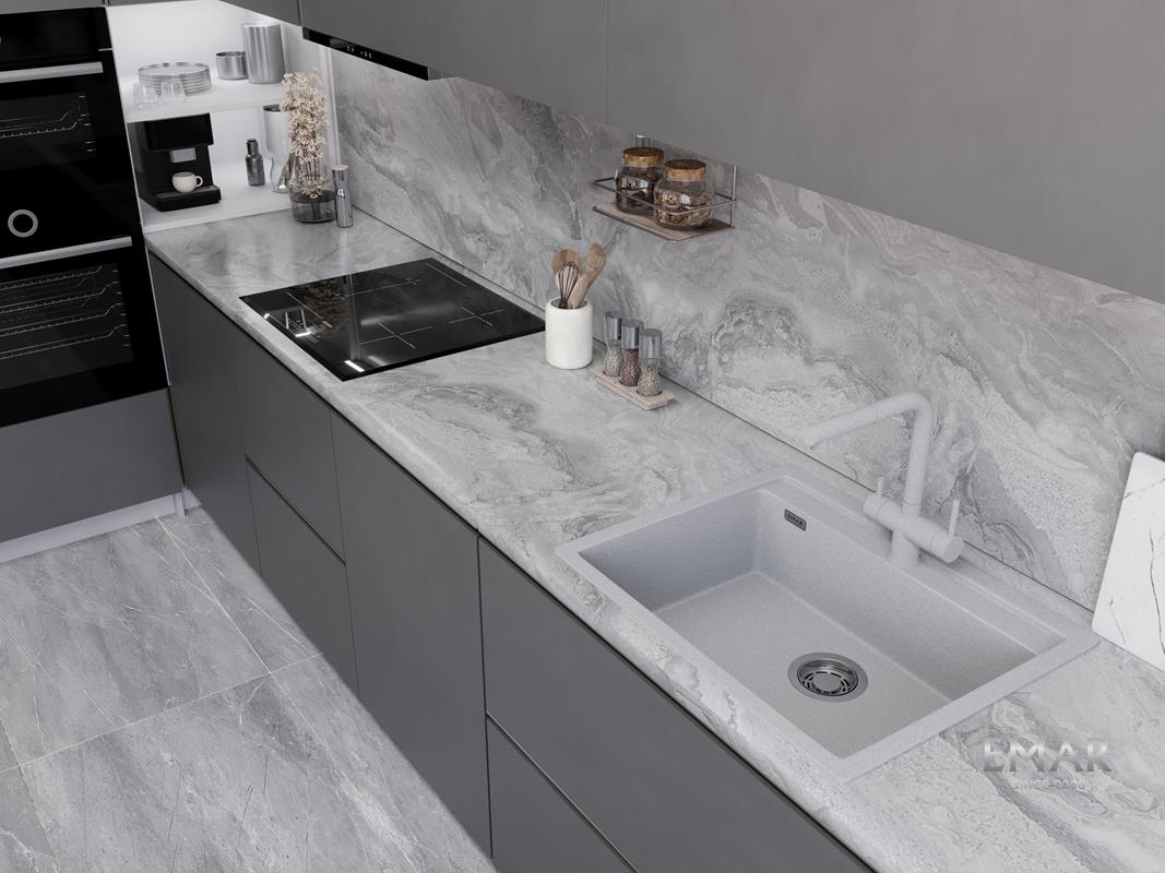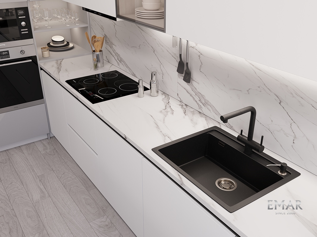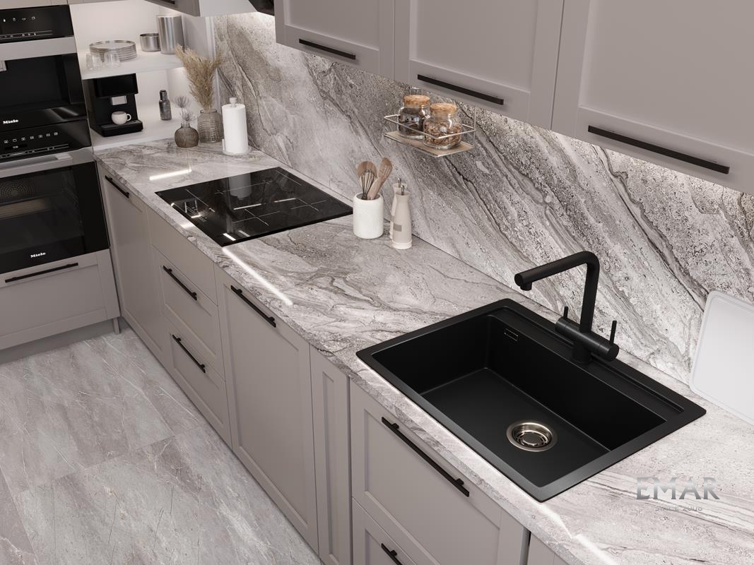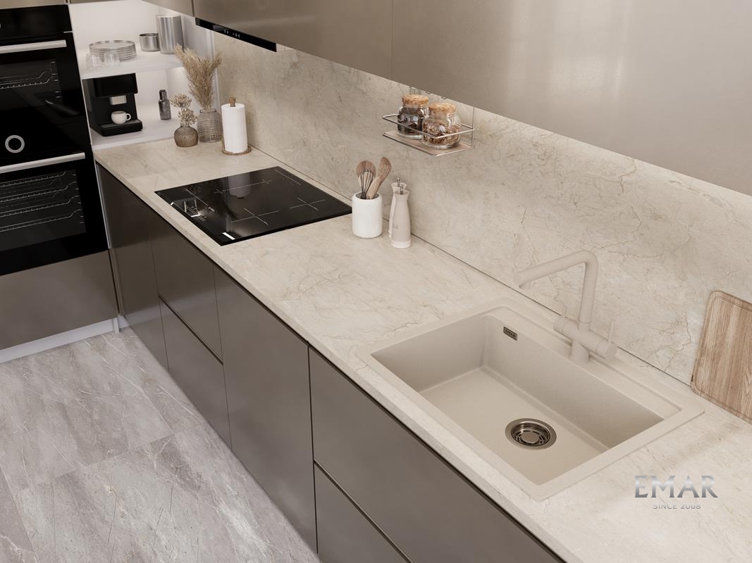 Кухонные мойки EMAR QUARTZ на 78% состоят из измельченного кварца различных фракций и 22% связующих полиэфирных смол модифицированных метилметакрилатом.