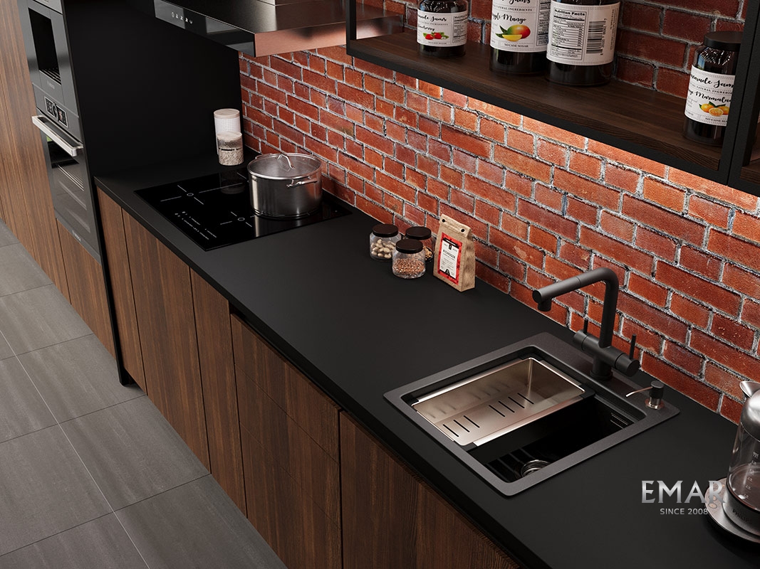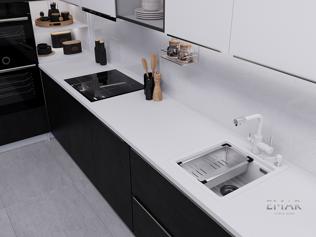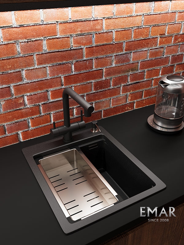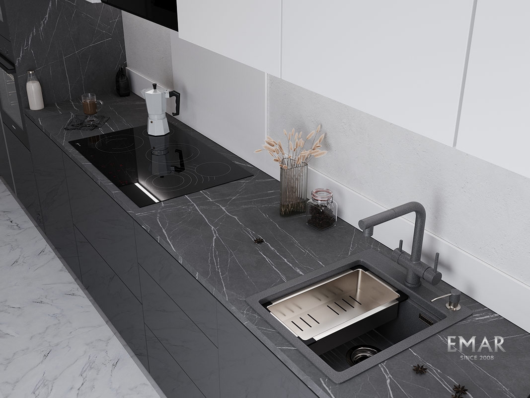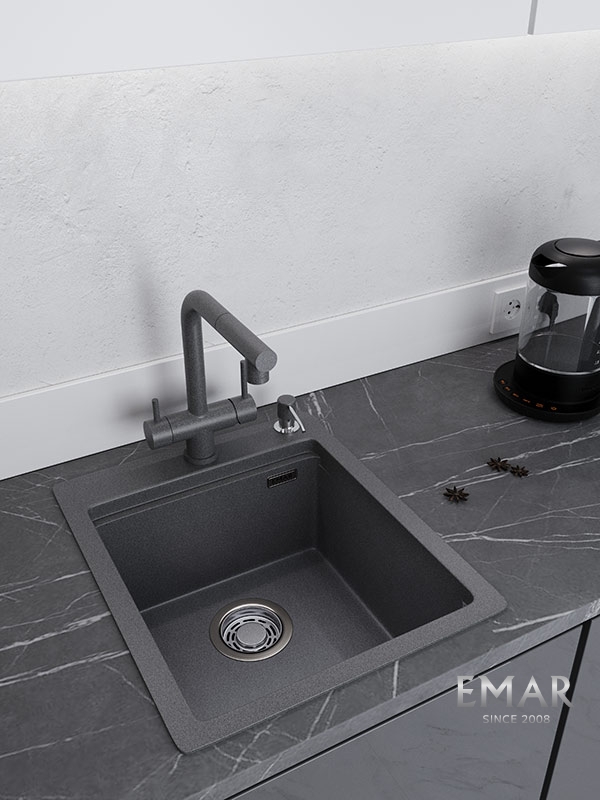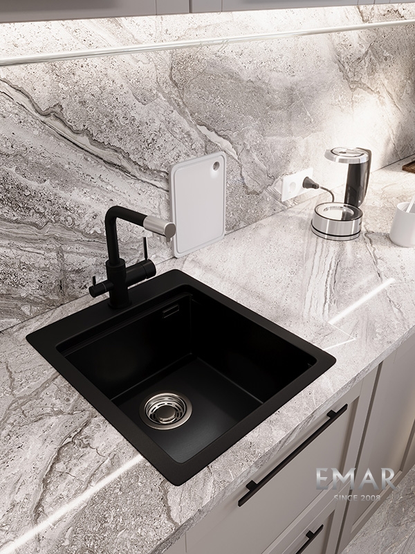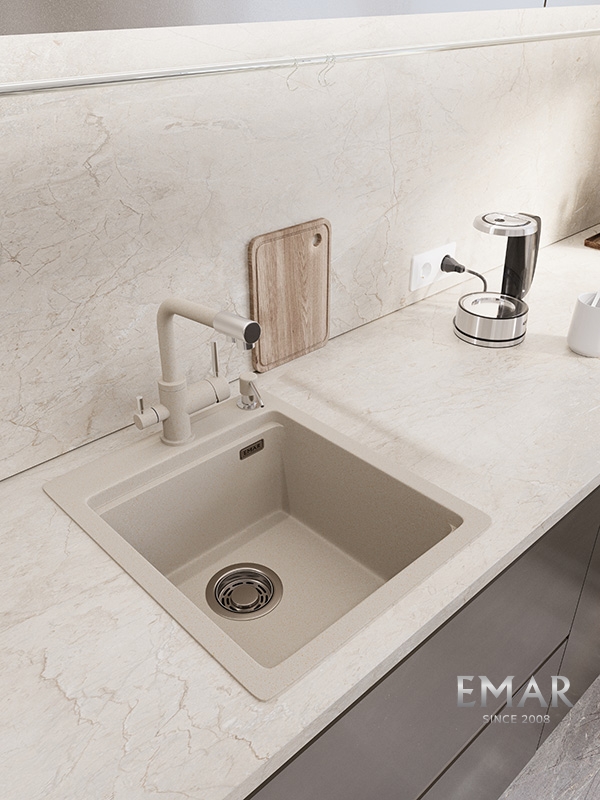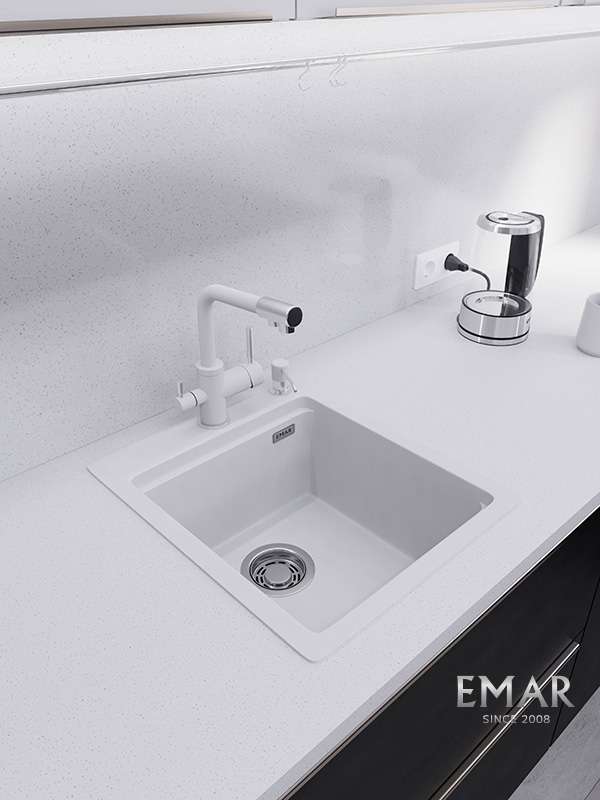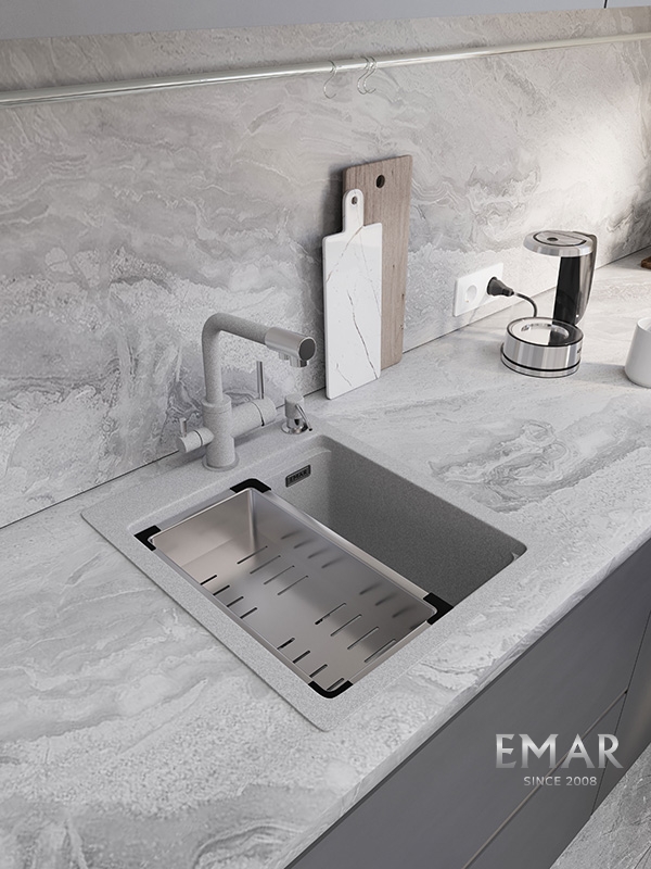 Кухонные мойки EMAR QUARTZ на 78% состоят из измельченного кварца различных фракций и 22% связующих полиэфирных смол модифицированных метилметакрилатом.