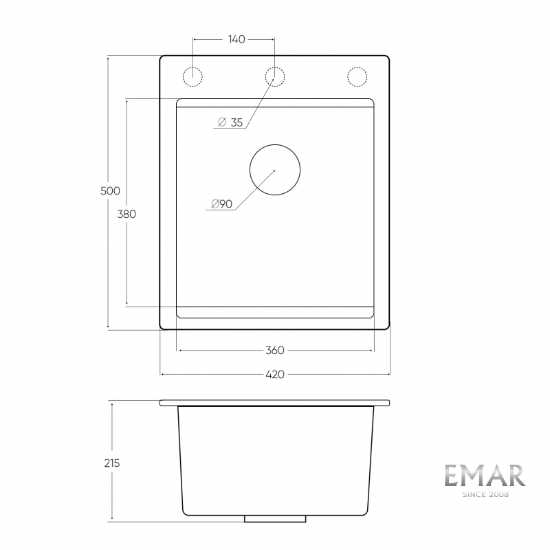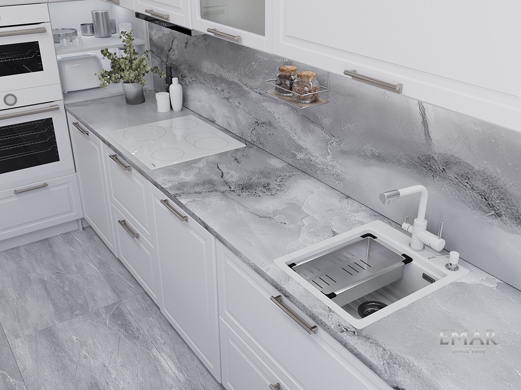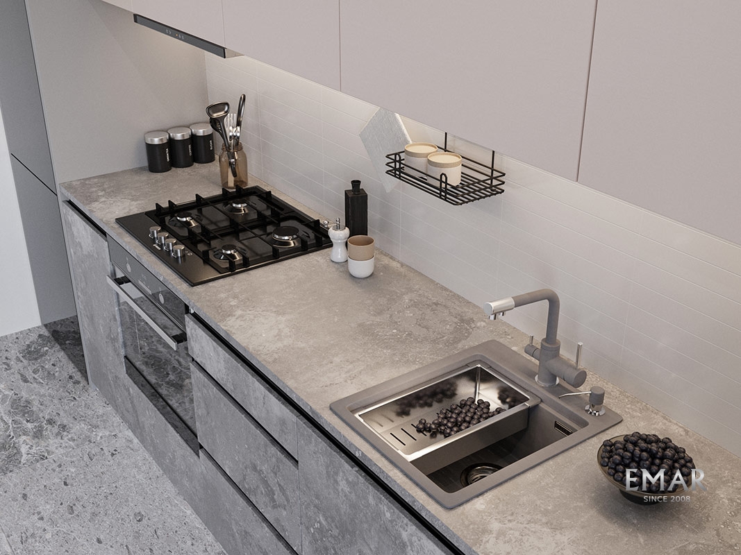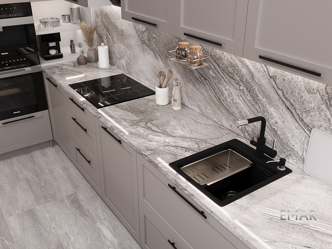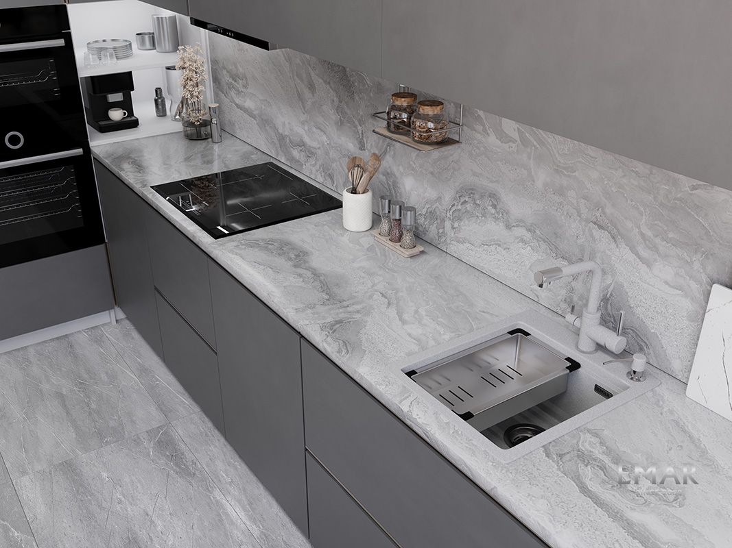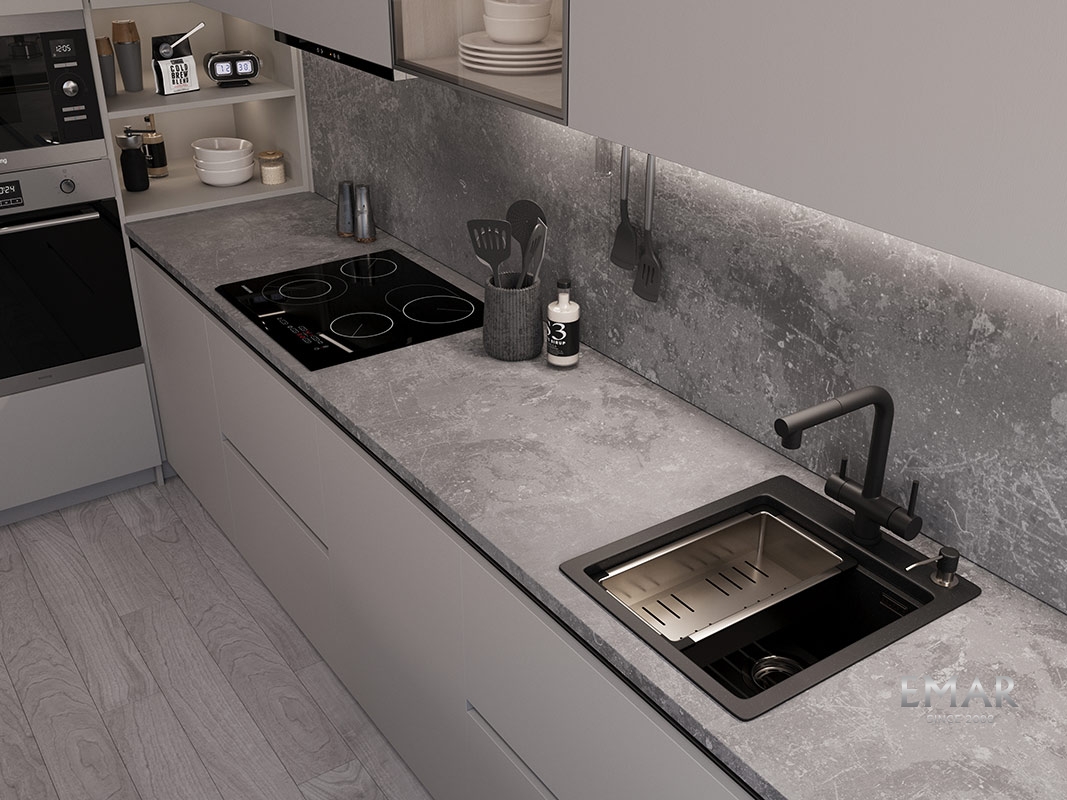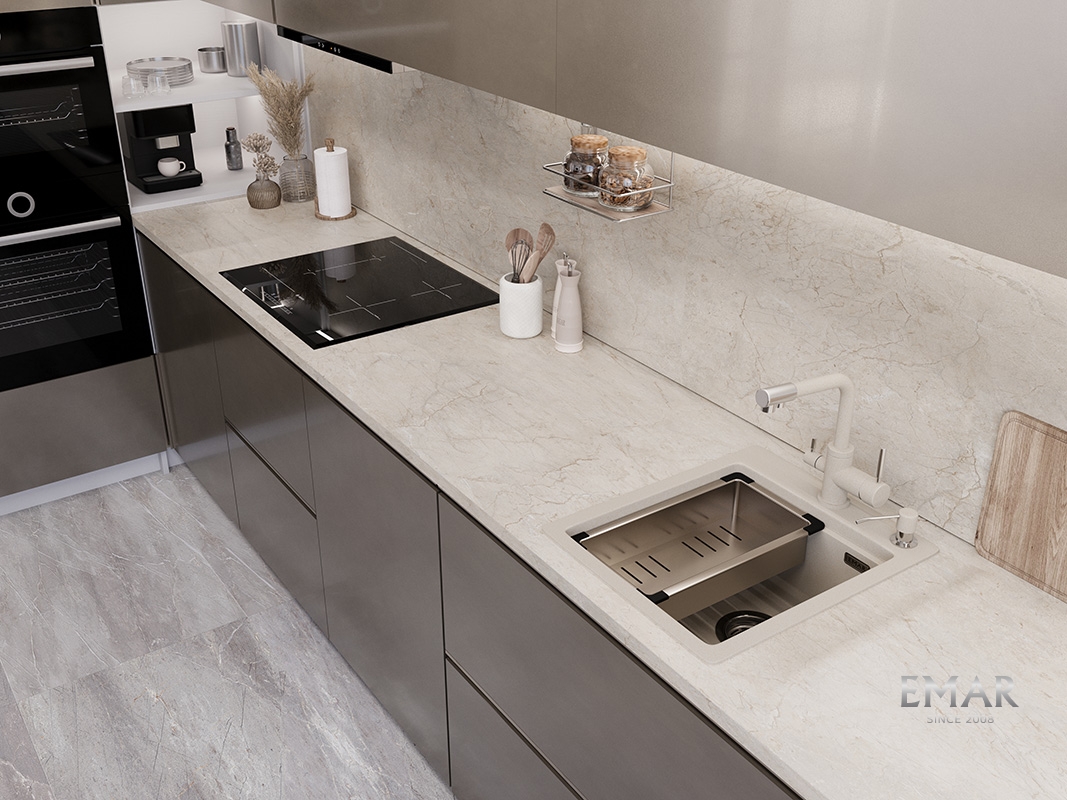 Кухонные мойки EMAR QUARTZ на 78% состоят из измельченного кварца различных фракций и 22% связующих полиэфирных смол модифицированных метилметакрилатом.