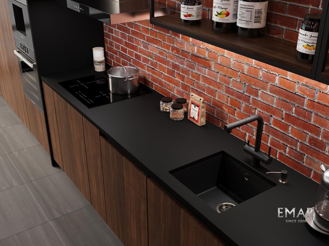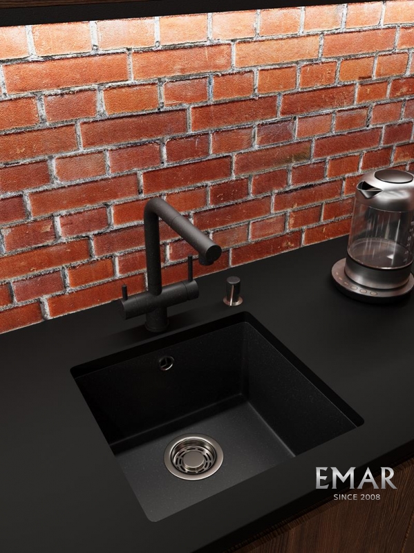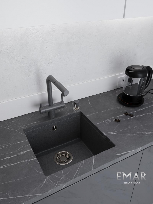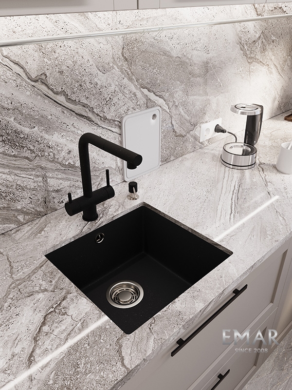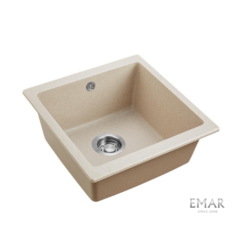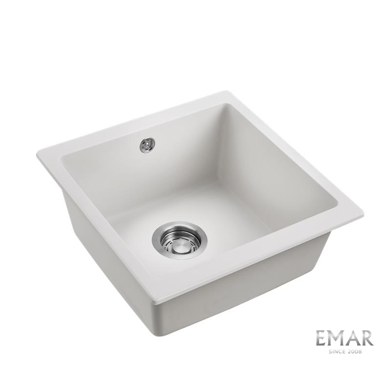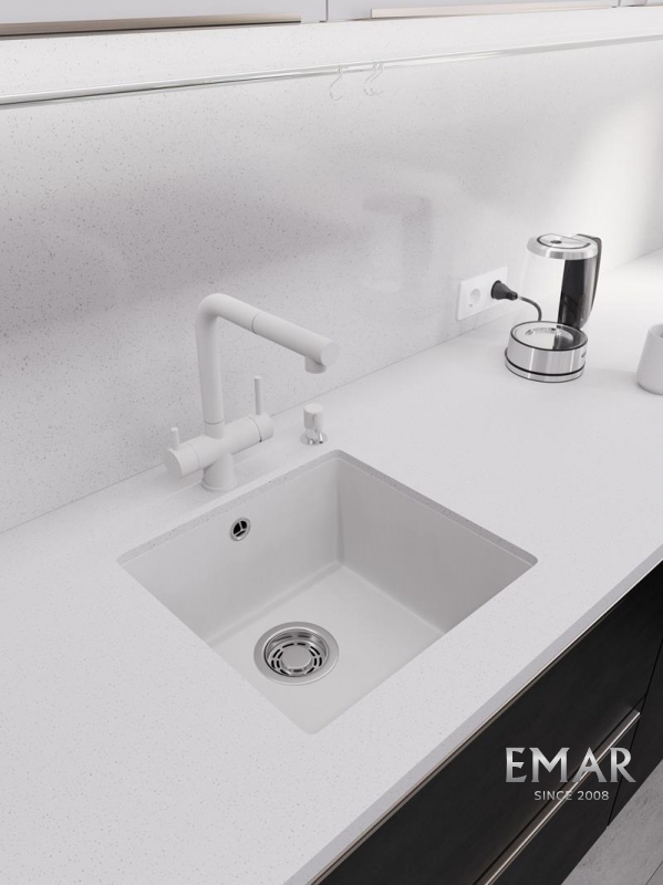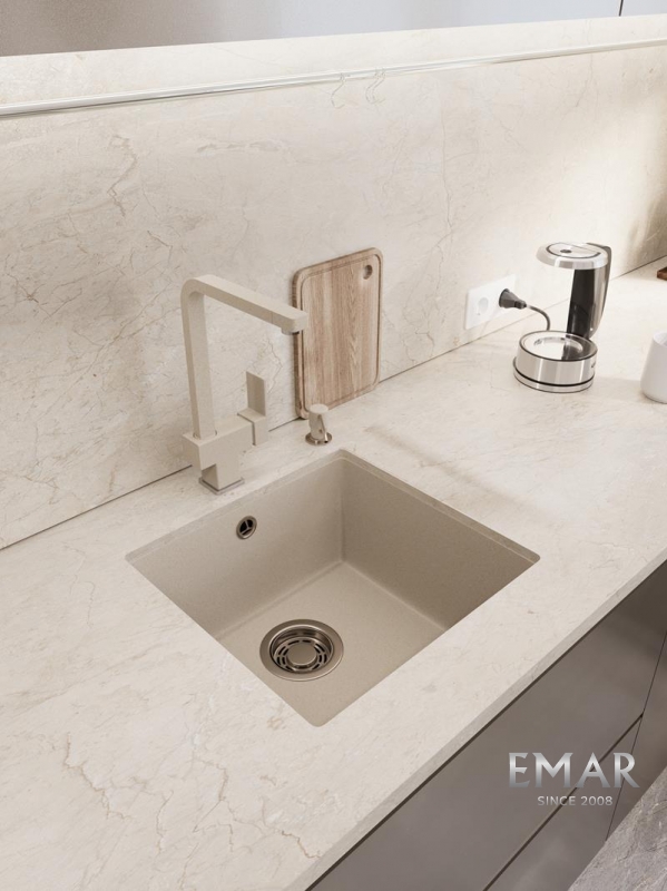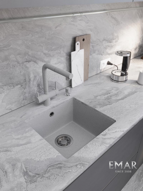 Кухонные мойки EMAR QUARTZ на 78% состоят из измельченного кварца различных фракций и 22% связующих полиэфирных смол модифицированных метилметакрилатом.