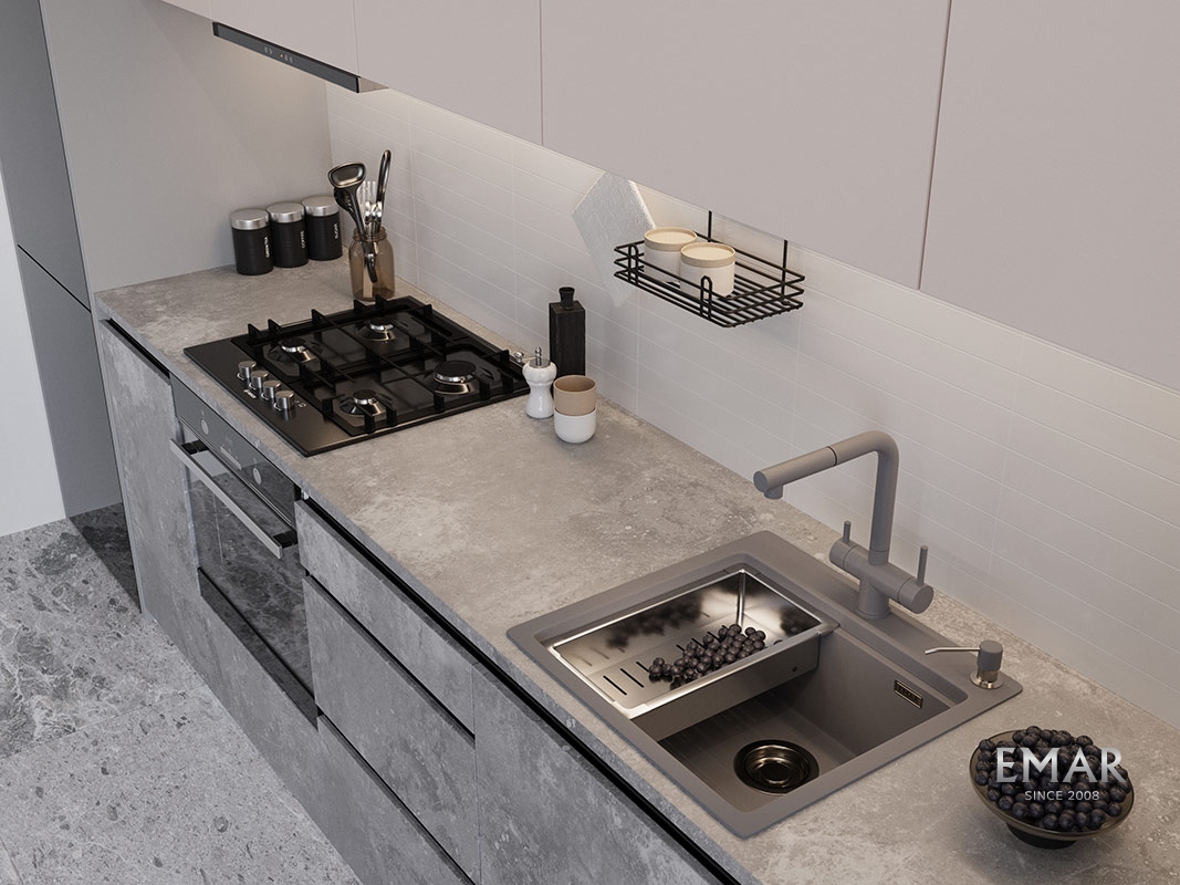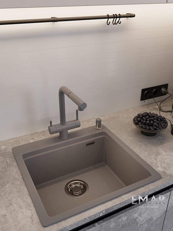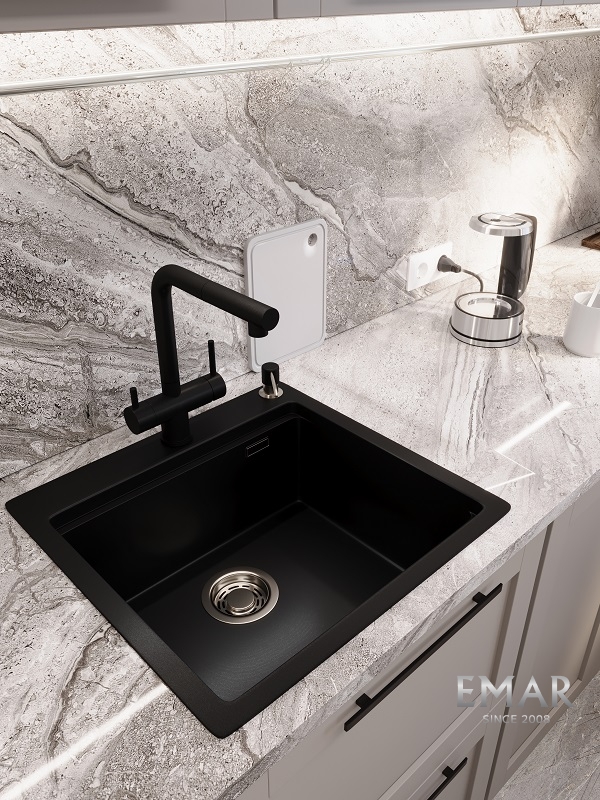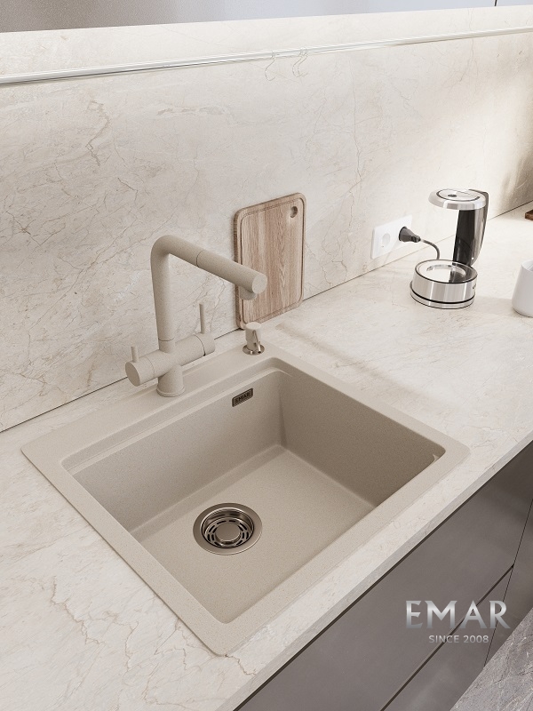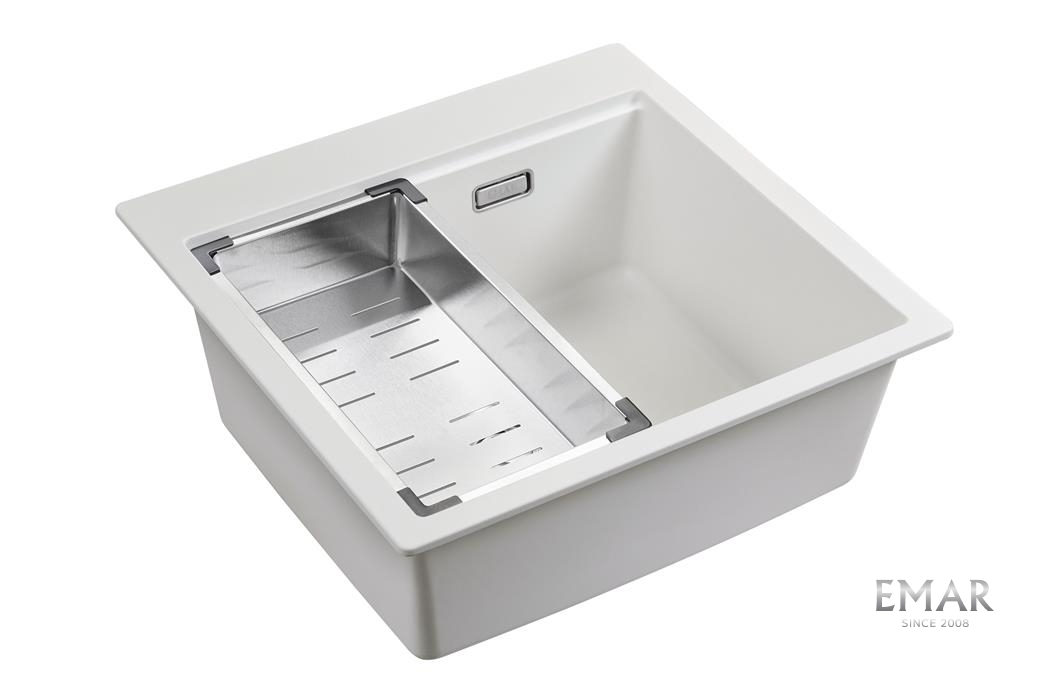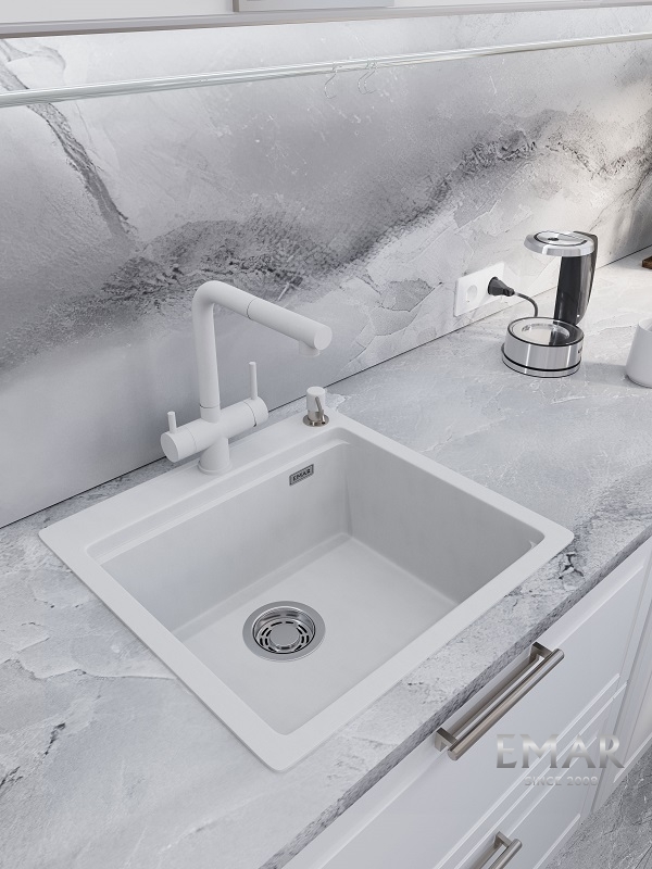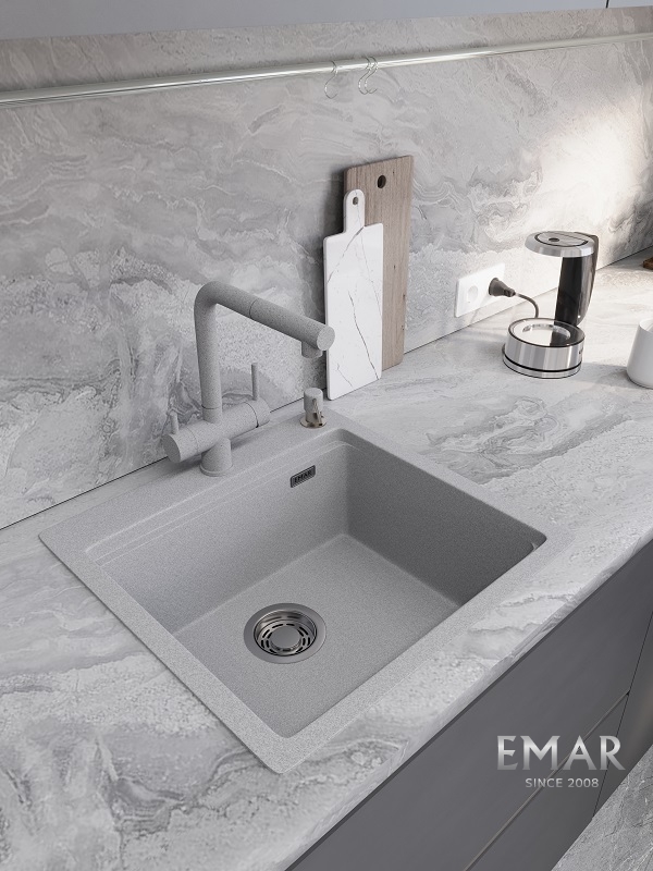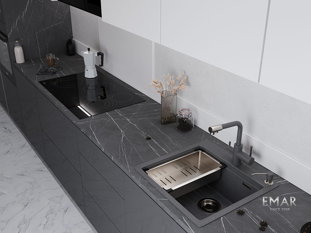 Кухонные мойки EMAR QUARTZ на 78% состоят из измельченного кварца различных фракций и 22% связующих полиэфирных смол модифицированных метилметакрилатом.