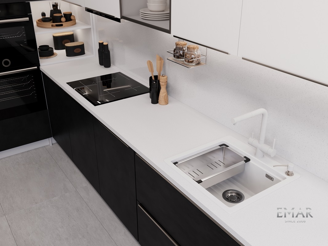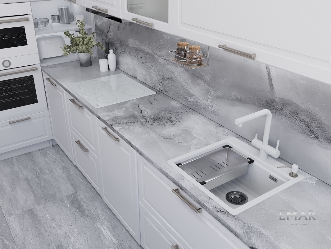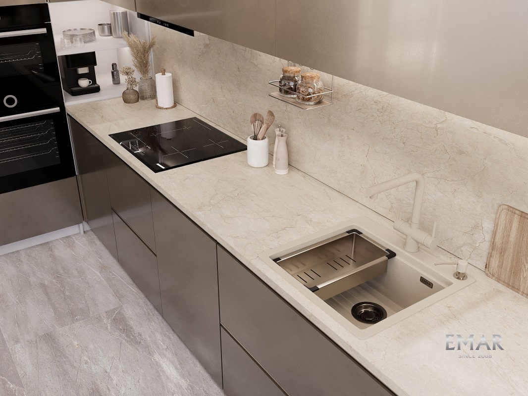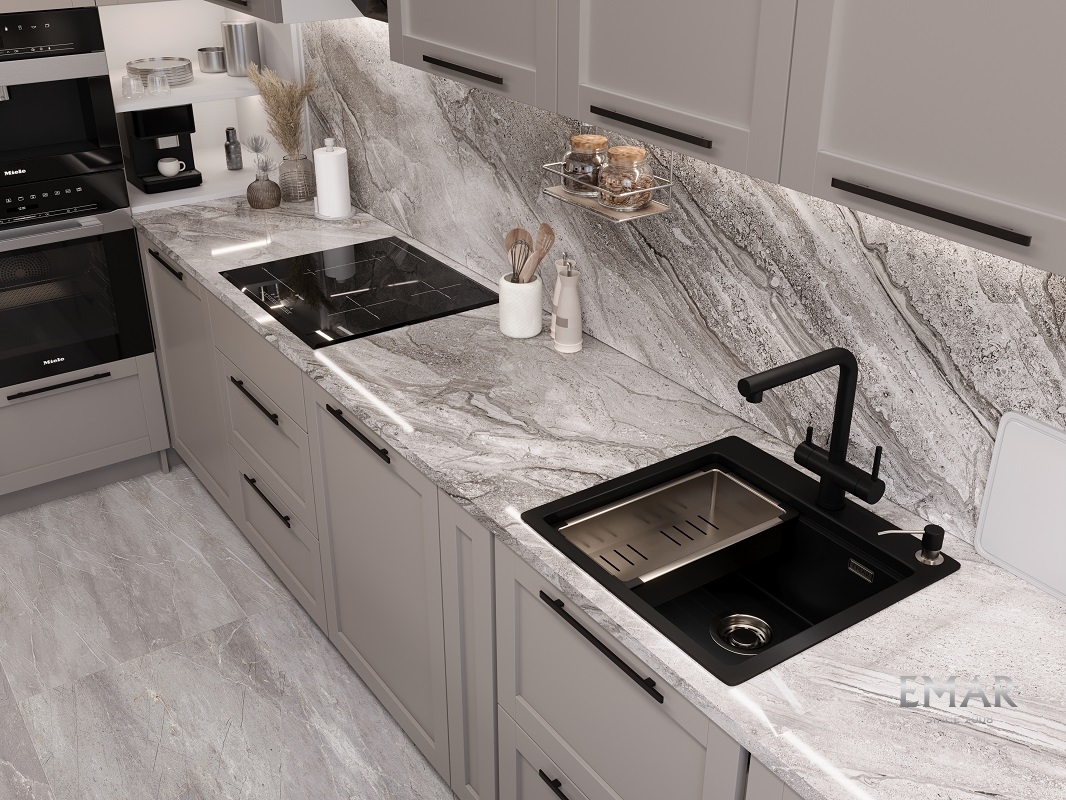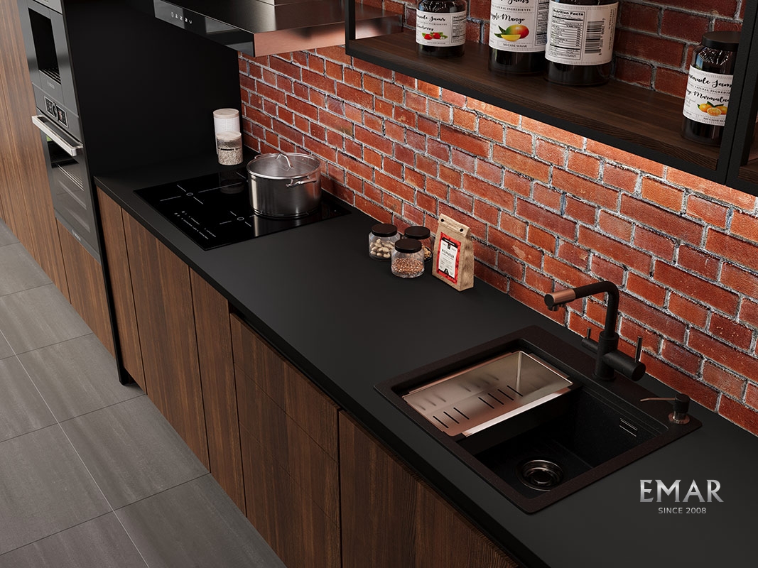 Кухонные мойки EMAR QUARTZ на 78% состоят из измельченного кварца различных фракций и 22% связующих полиэфирных смол модифицированных метилметакрилатом.