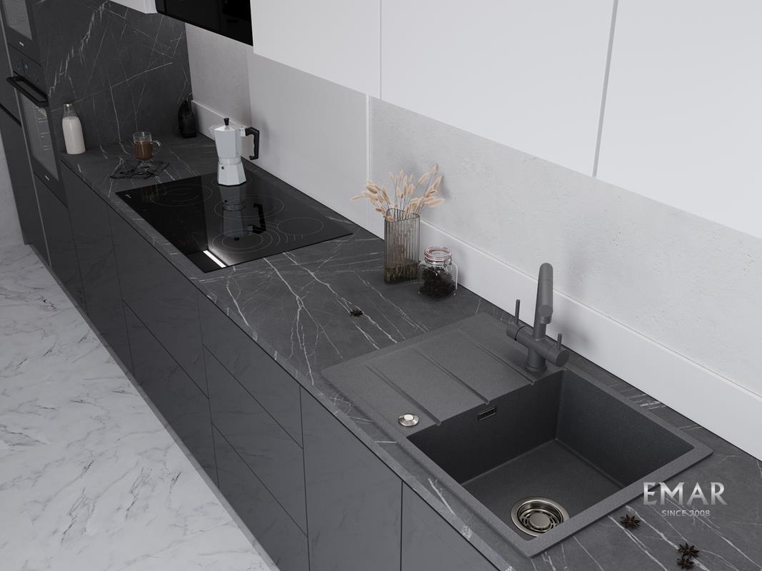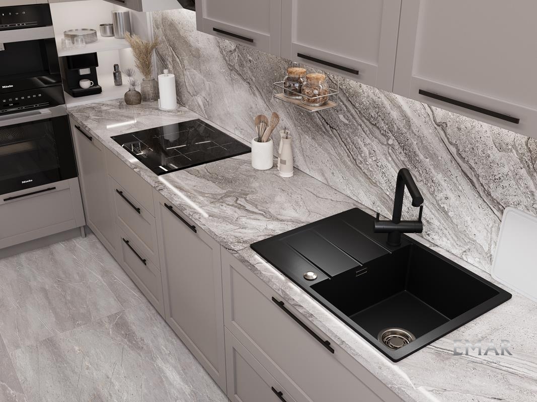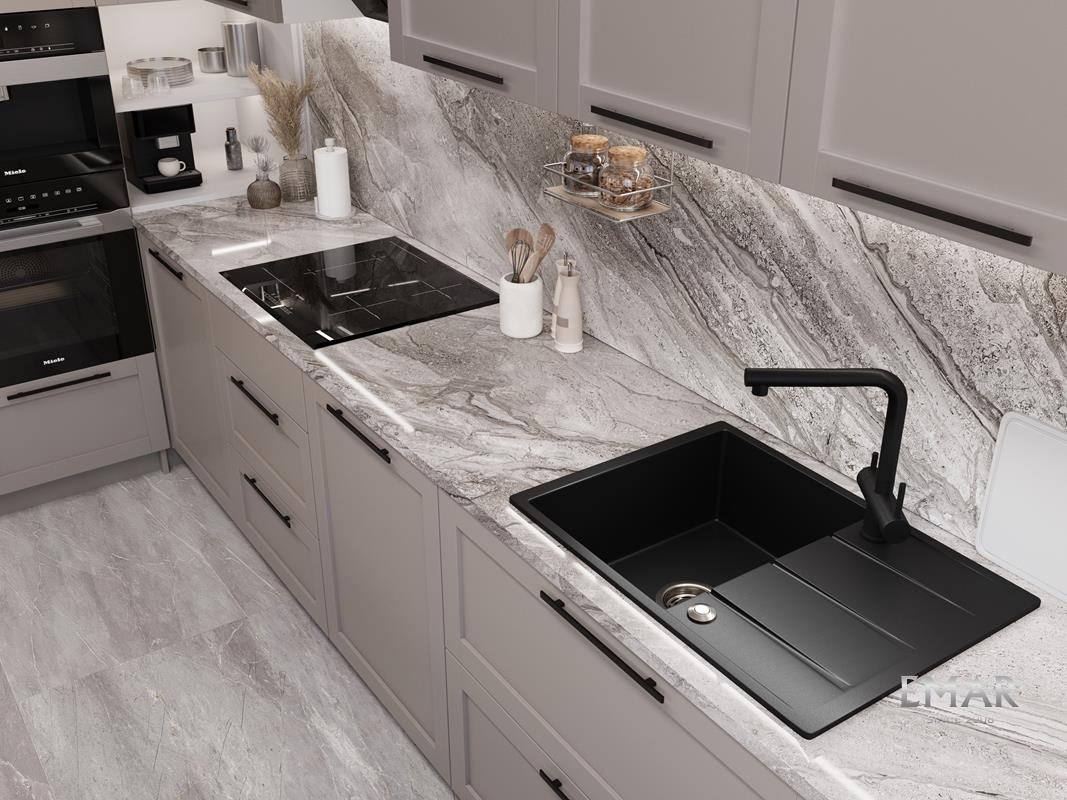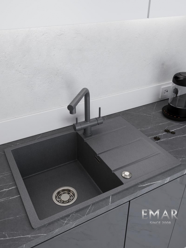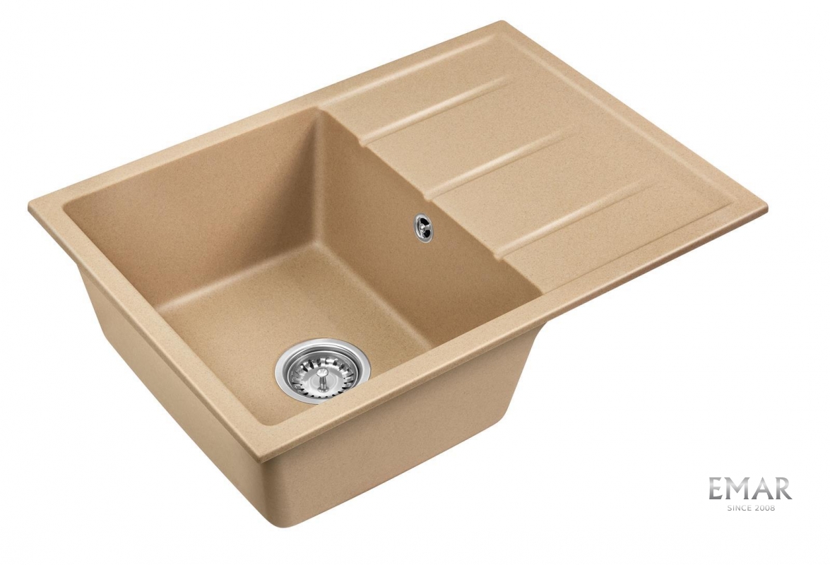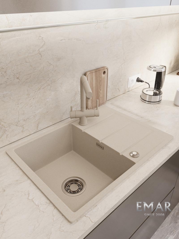 Кухонные мойки EMAR QUARTZ на 78% состоят из измельченного кварца различных фракций и 22% связующих полиэфирных смол модифицированных метилметакрилатом.