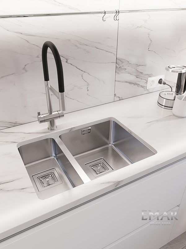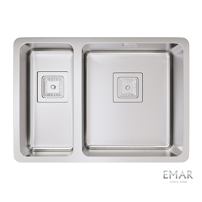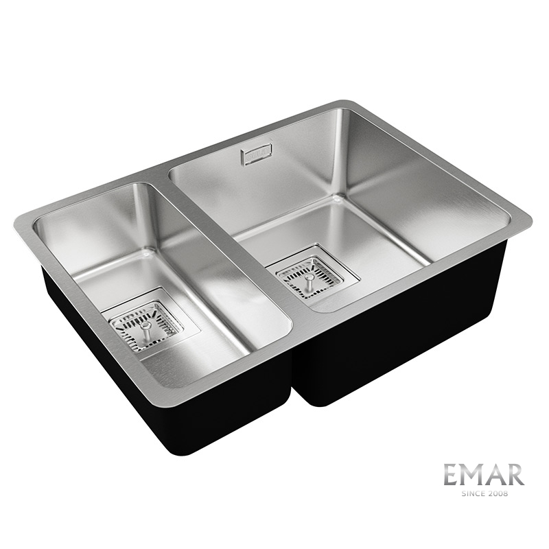 Мойка из нержавеющей стали AISI. AISI 304 содержит 18% хрома и 9% никеля, что обеспечивает максимальную устойчивость к коррозии. Шлифованная поверхность моек OULIN достигается по технологии Satin Finish Brushing. С обратной стороны, на дне чаши, находятся резиновые шумопоглащающие накладки и антиконденсатное покрытие, что делает мойку бесшумной.