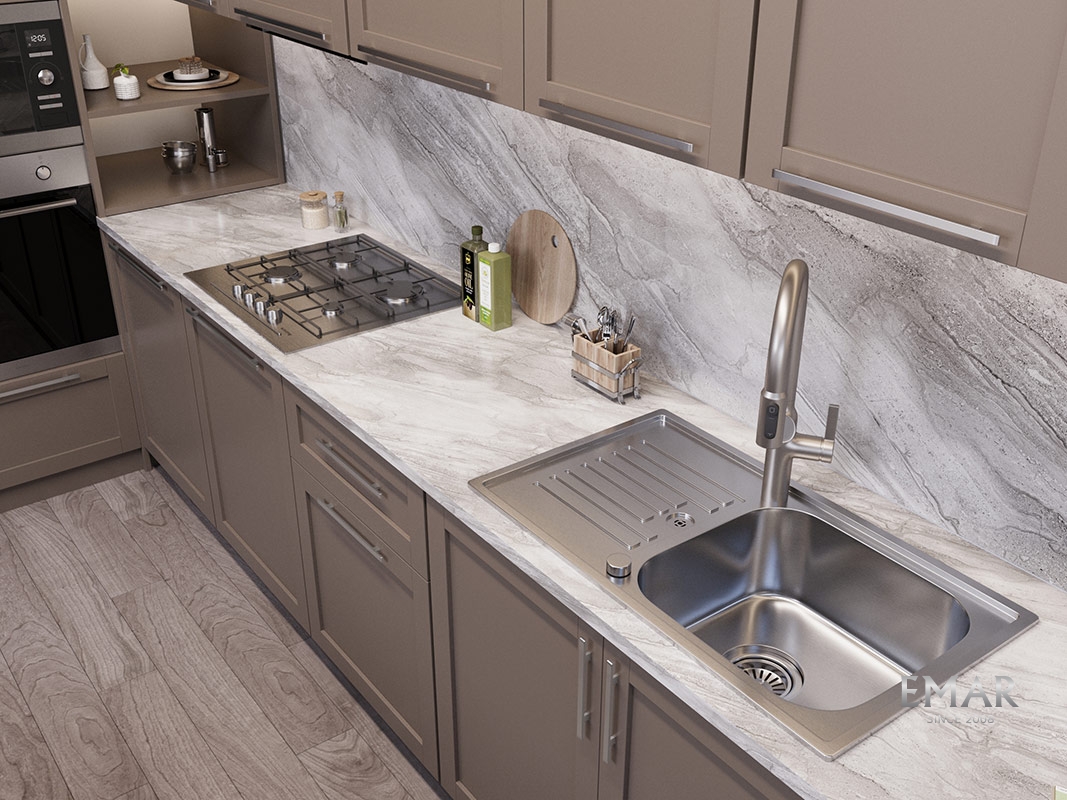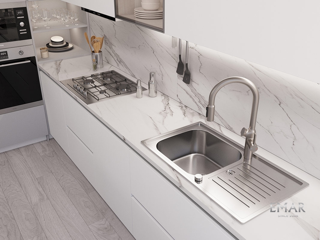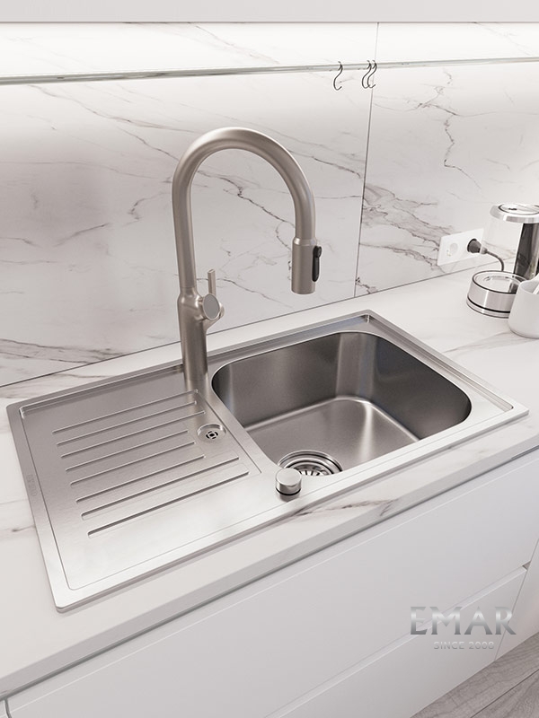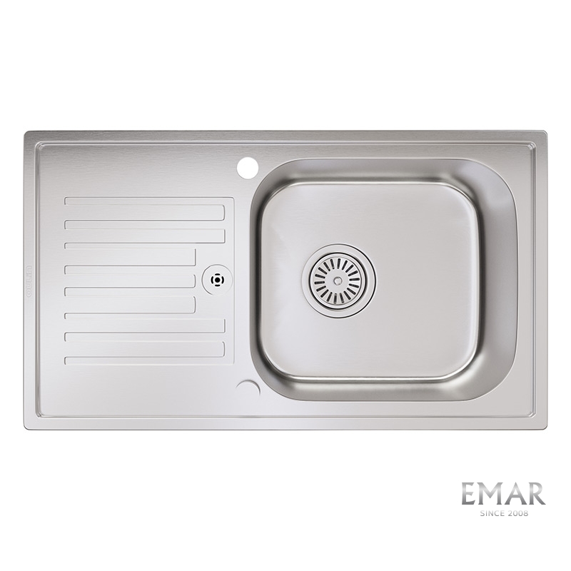 Мойка из нержавеющей стали AISI. AISI 304 содержит 18% хрома и 9% никеля, что обеспечивает максимальную устойчивость к коррозии. Шлифованная поверхность моек OULIN достигается по технологии Satin Finish Brushing. С обратной стороны, на дне чаши, находятся резиновые шумопоглащающие накладки и антиконденсатное покрытие, что делает мойку бесшумной.