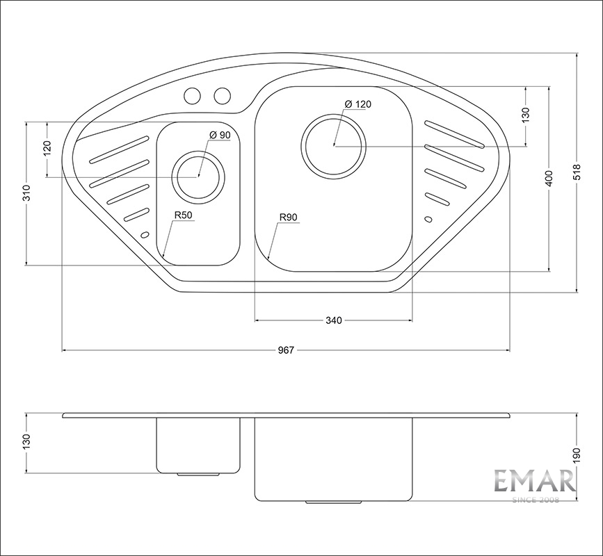 • Размер сливного отверстия: 120 мм (большая чаша) и 90 мм (маленькая чаша)