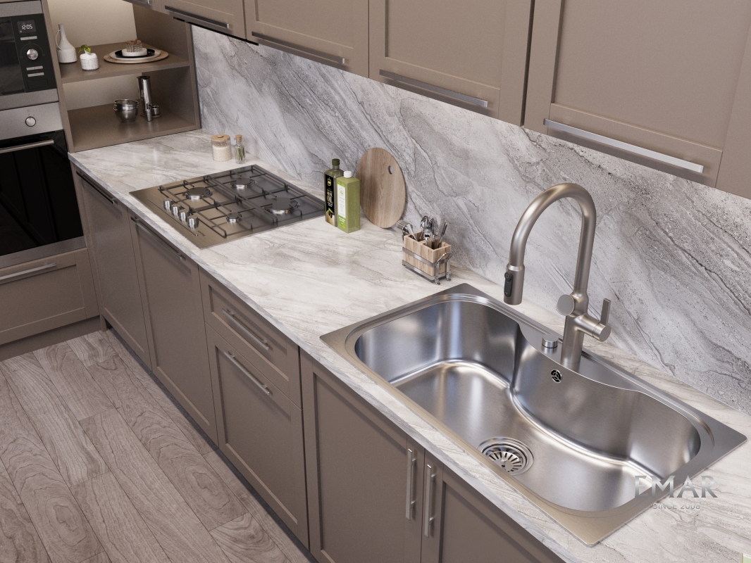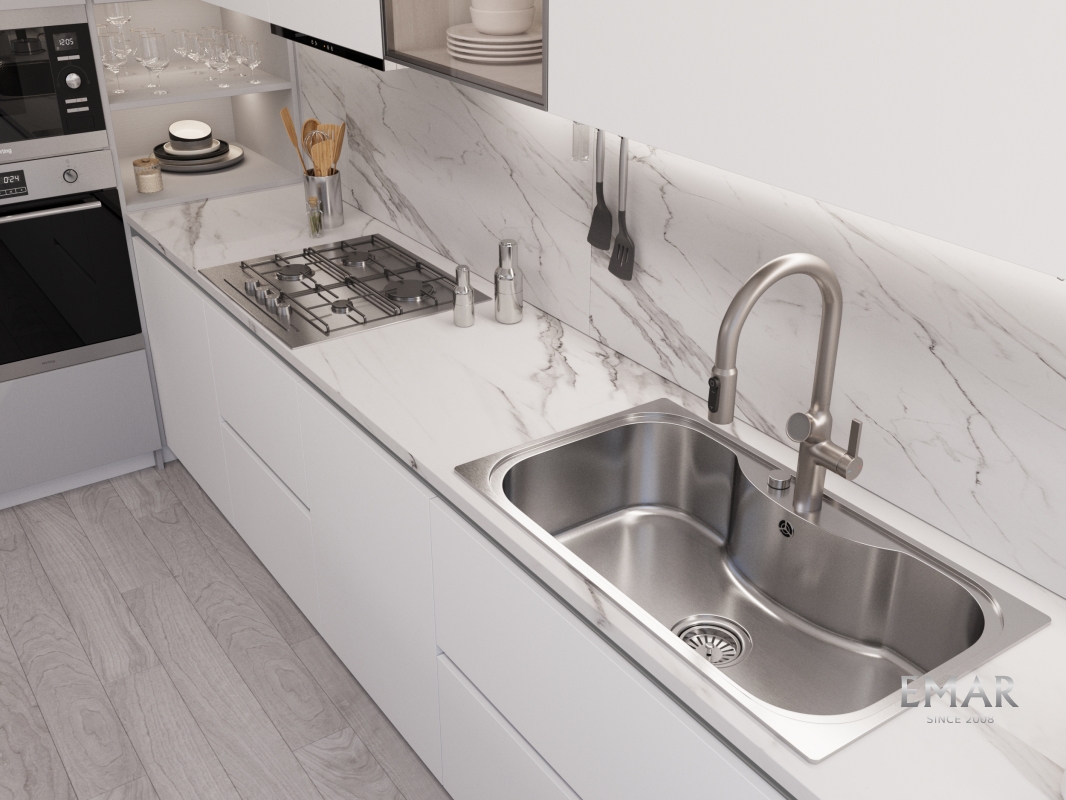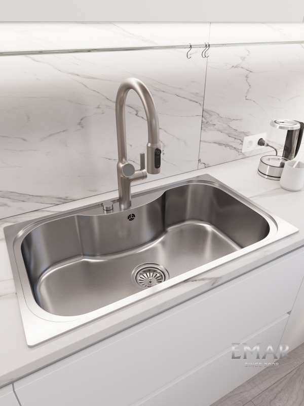Мойка из нержавеющей стали AISI. AISI 304 содержит 18% хрома и 9% никеля, что обеспечивает максимальную устойчивость к коррозии. Шлифованная поверхность моек OULIN достигается по технологии Satin Finish Brushing. С обратной стороны, на дне чаши, находятся резиновые шумопоглащающие накладки и антиконденсатное покрытие, что делает мойку бесшумной.