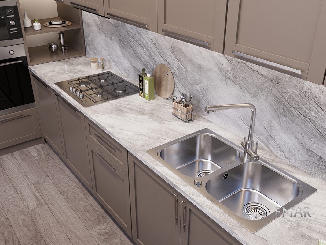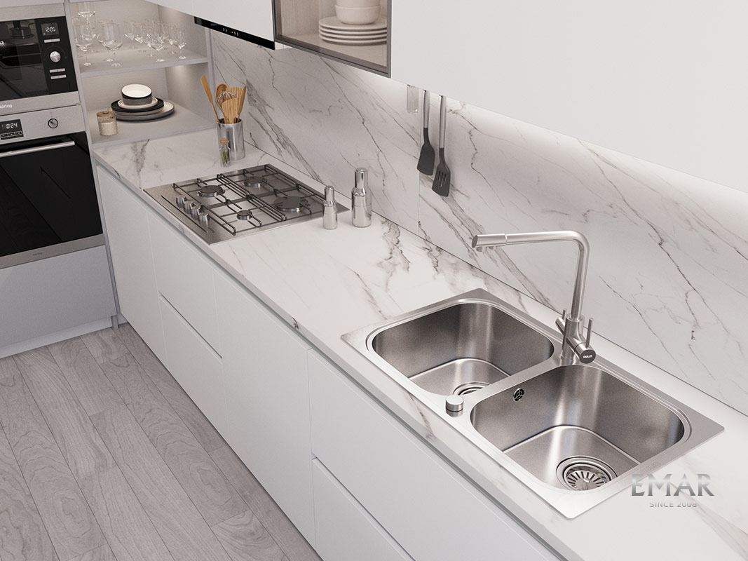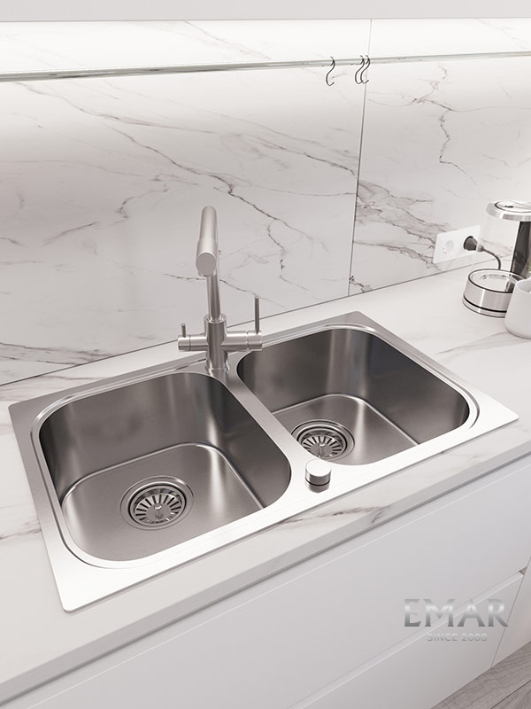 Мойка из нержавеющей стали AISI. AISI 304 содержит 18% хрома и 9% никеля, что обеспечивает максимальную устойчивость к коррозии. Шлифованная поверхность моек OULIN достигается по технологии Satin Finish Brushing. С обратной стороны, на дне чаши, находятся резиновые шумопоглащающие накладки и антиконденсатное покрытие, что делает мойку бесшумной.
