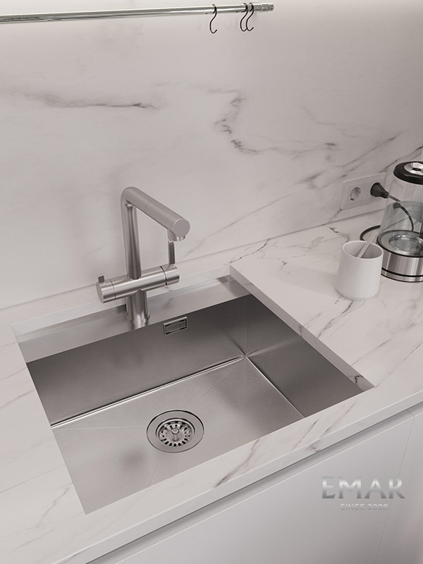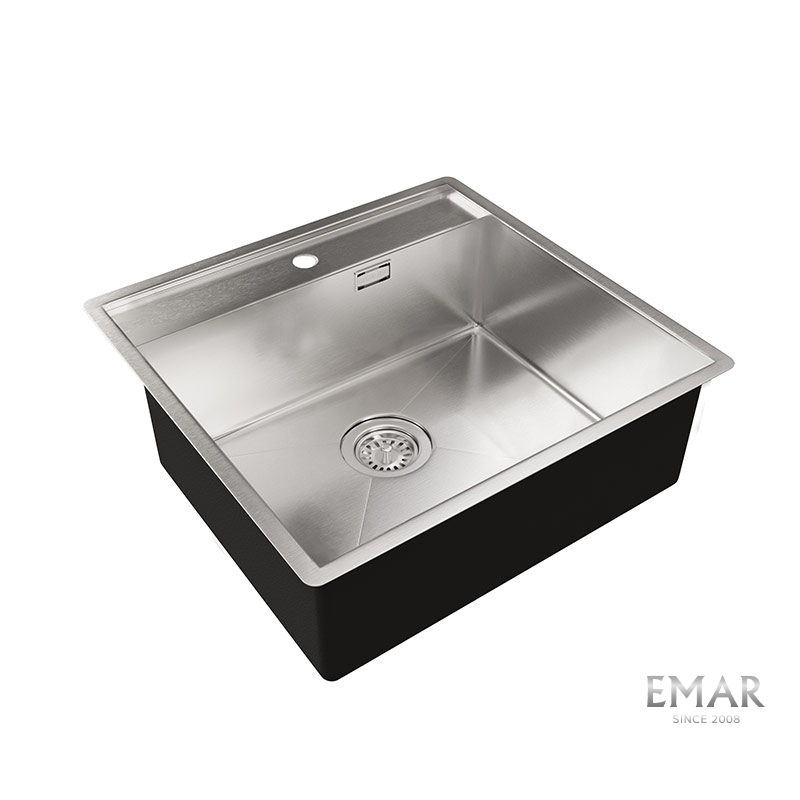 Мойка из нержавеющей стали AISI. AISI 304 содержит 18% хрома и 9% никеля, что обеспечивает максимальную устойчивость к коррозии. Шлифованная поверхность моек OULIN достигается по технологии Satin Finish Brushing. С обратной стороны, на дне чаши, находятся резиновые шумопоглащающие накладки и антиконденсатное покрытие, что делает мойку бесшумной.