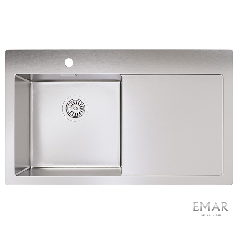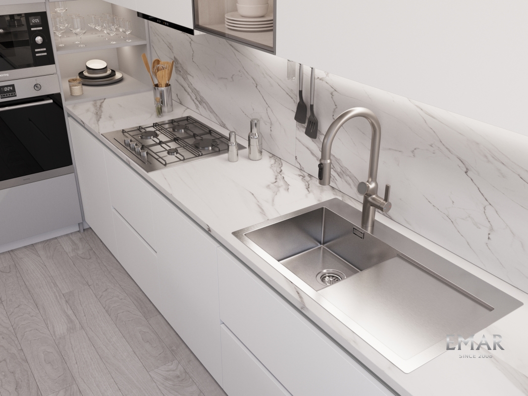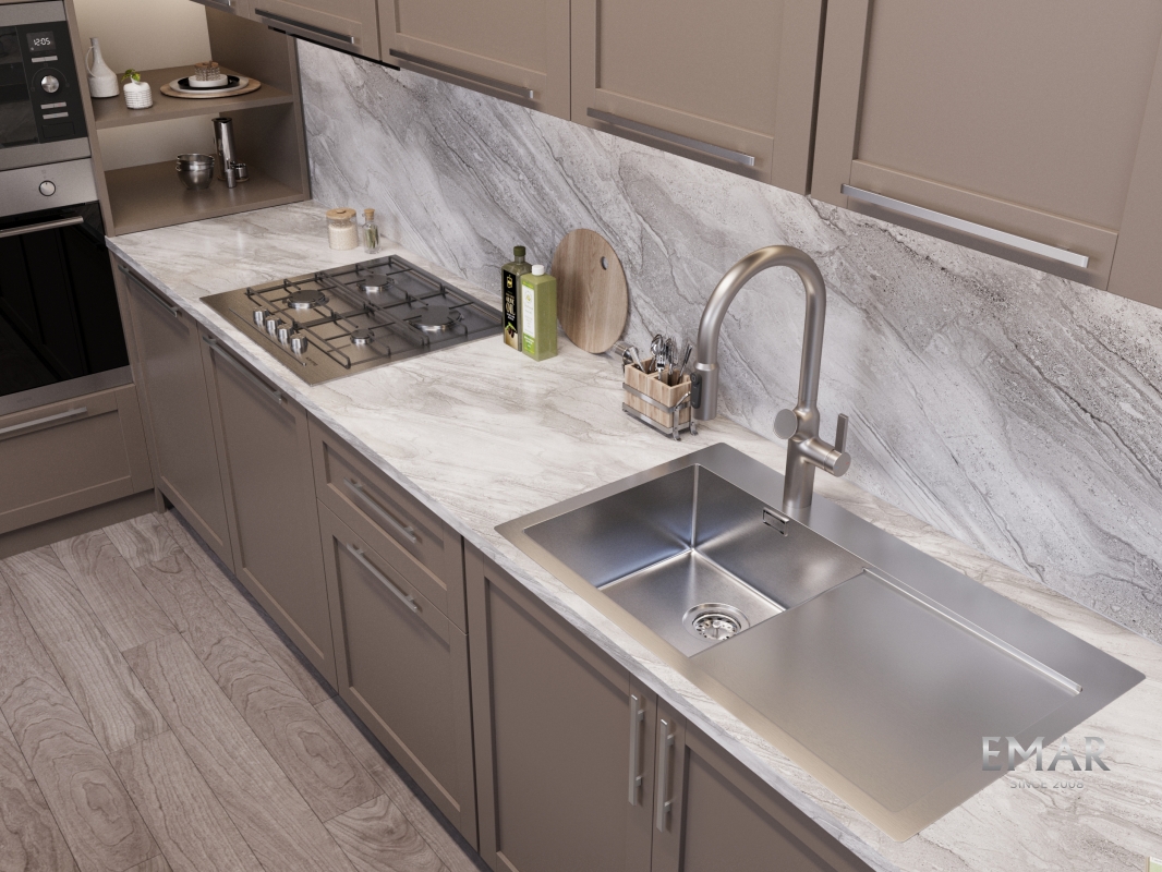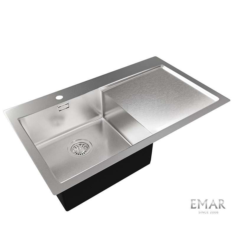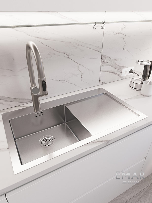 Мойка из нержавеющей стали AISI. AISI 304 содержит 18% хрома и 9% никеля, что обеспечивает максимальную устойчивость к коррозии. Шлифованная поверхность моек OULIN достигается по технологии Satin Finish Brushing. С обратной стороны, на дне чаши, находятся резиновые шумопоглащающие накладки и антиконденсатное покрытие, что делает мойку бесшумной.