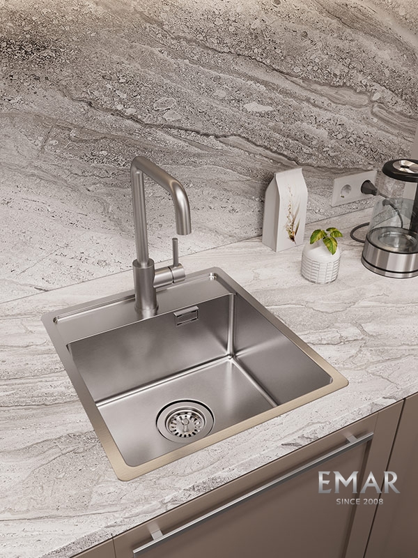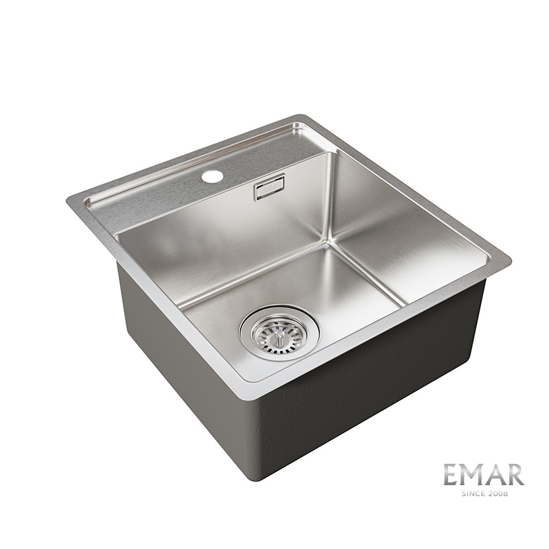 Мойка из нержавеющей стали AISI. AISI 304 содержит 18% хрома и 9% никеля, что обеспечивает максимальную устойчивость к коррозии. Шлифованная поверхность моек OULIN достигается по технологии Satin Finish Brushing. С обратной стороны, на дне чаши, находятся резиновые шумопоглащающие накладки и антиконденсатное покрытие, что делает мойку бесшумной.