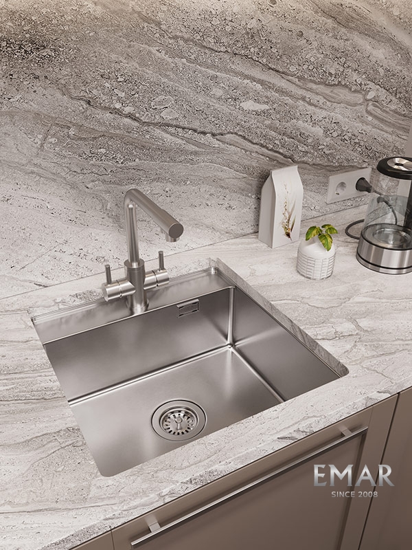 Мойка из нержавеющей стали AISI. AISI 304 содержит 18% хрома и 9% никеля, что обеспечивает максимальную устойчивость к коррозии. Шлифованная поверхность моек OULIN достигается по технологии Satin Finish Brushing. С обратной стороны, на дне чаши, находятся резиновые шумопоглащающие накладки и антиконденсатное покрытие, что делает мойку бесшумной.