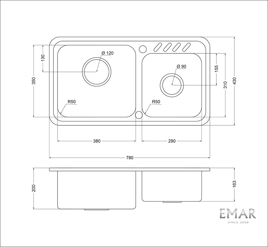 • Размеры мойки: 780 x 430 мм