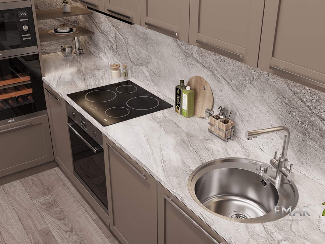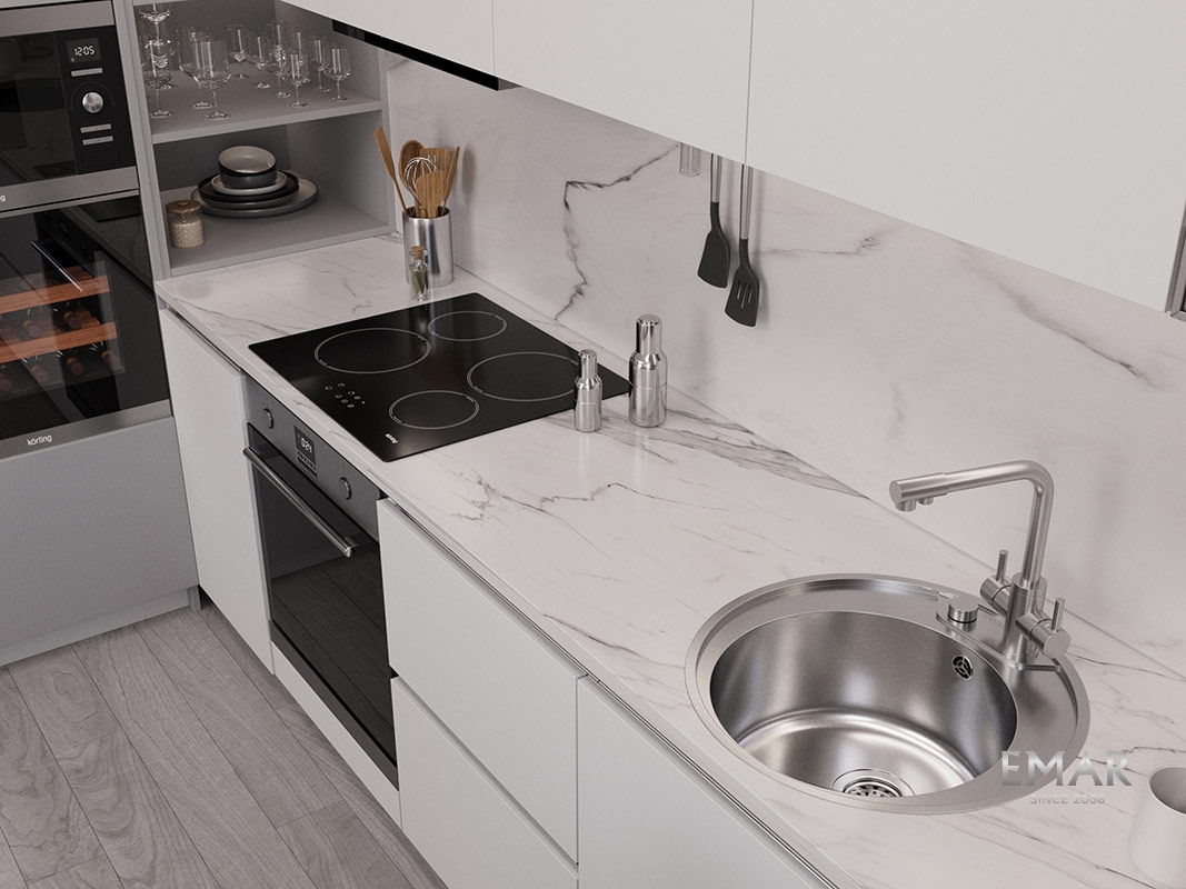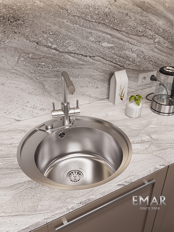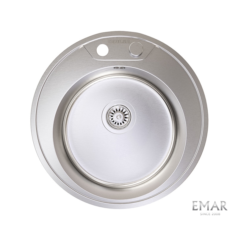 Мойка из нержавеющей стали AISI. AISI 304 содержит 18% хрома и 9% никеля, что обеспечивает максимальную устойчивость к коррозии. Шлифованная поверхность моек OULIN достигается по технологии Satin Finish Brushing. С обратной стороны, на дне чаши, находятся резиновые шумопоглащающие накладки и антиконденсатное покрытие, что делает мойку бесшумной.