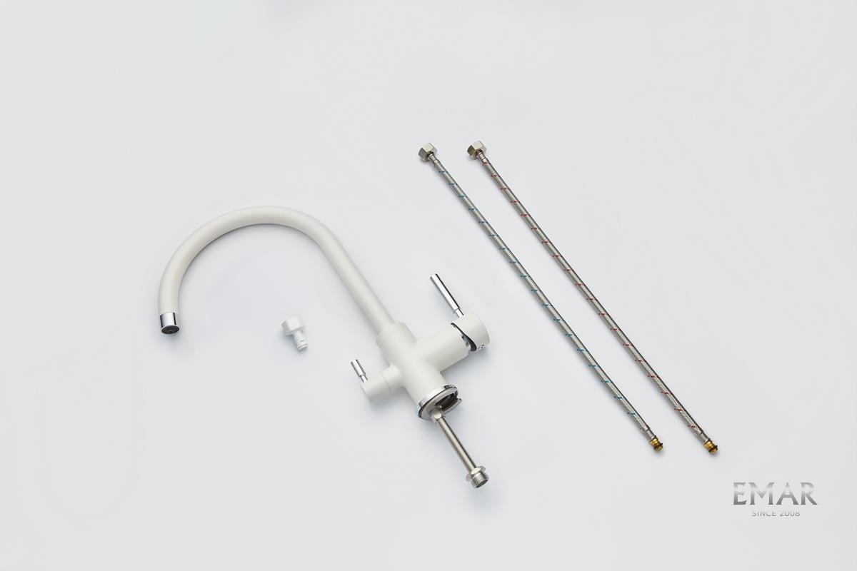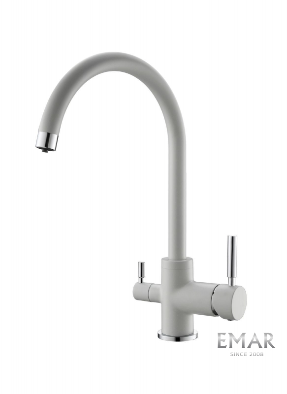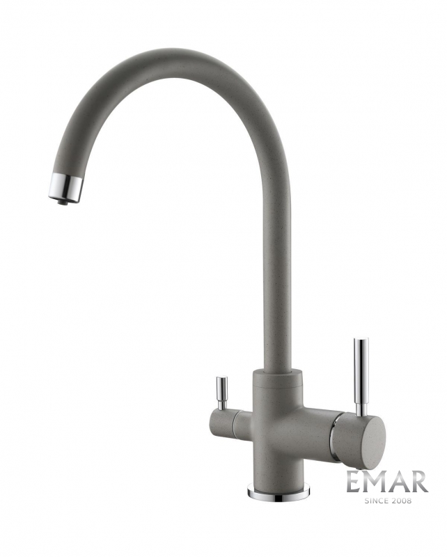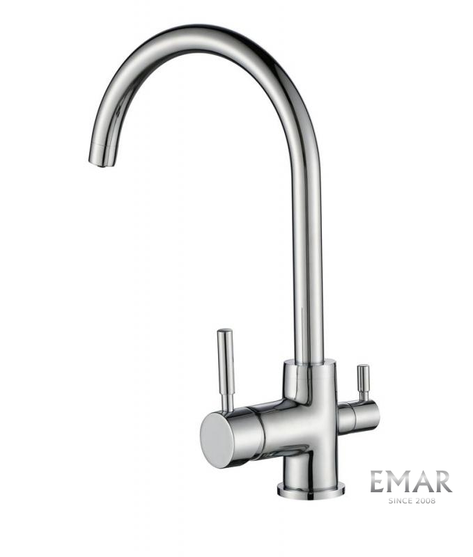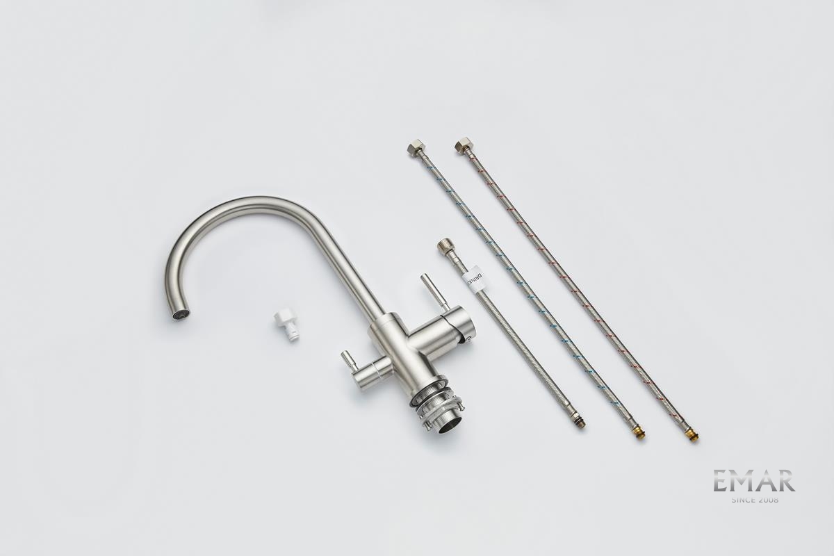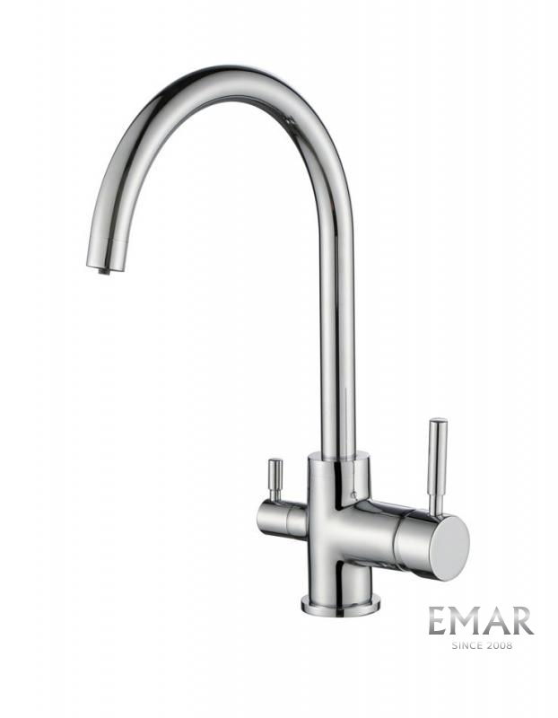 Кухонный смеситель с возможностью подключения фильтра для очистки воды. Фильтрованная вода подается отдельной ручкой через отдельную трубку и не смешивается с водопроводной водой. Однорычажное управление поможет легко регулировать температуру и напор подачи воды. Соответствует стандартам DIN DVGW.