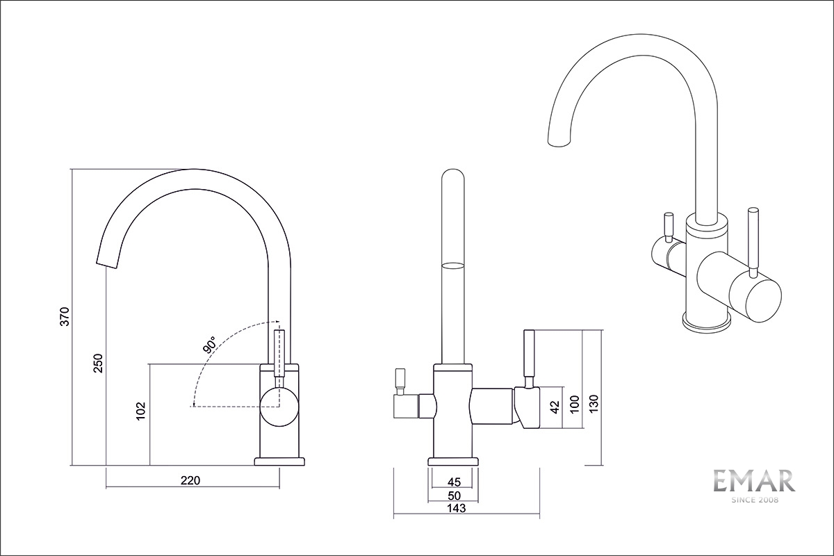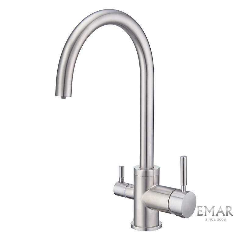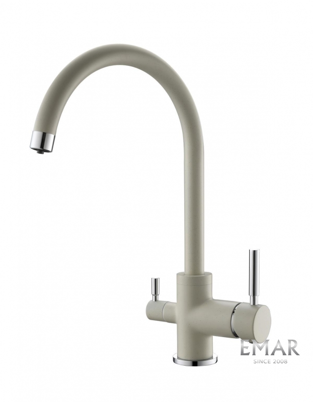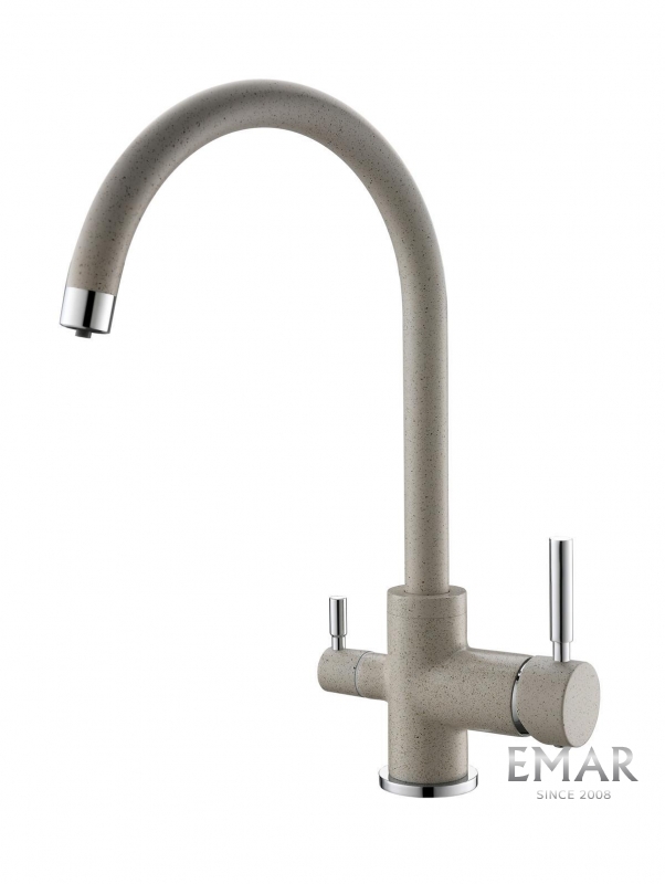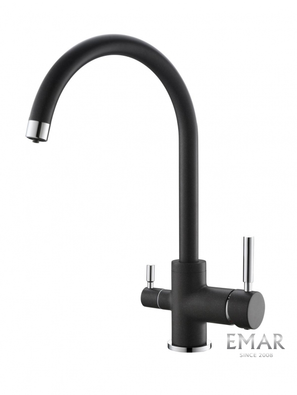 Кухонный смеситель с возможностью подключения фильтра для очистки воды. Фильтрованная вода подается отдельной ручкой через отдельную трубку и не смешивается с водопроводной водой. Однорычажное управление поможет легко регулировать температуру и напор подачи воды. Соответствует стандартам DIN DVGW.