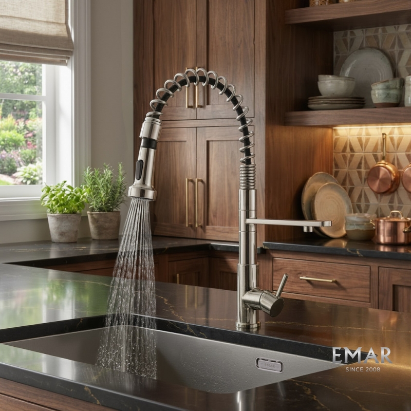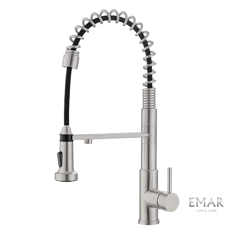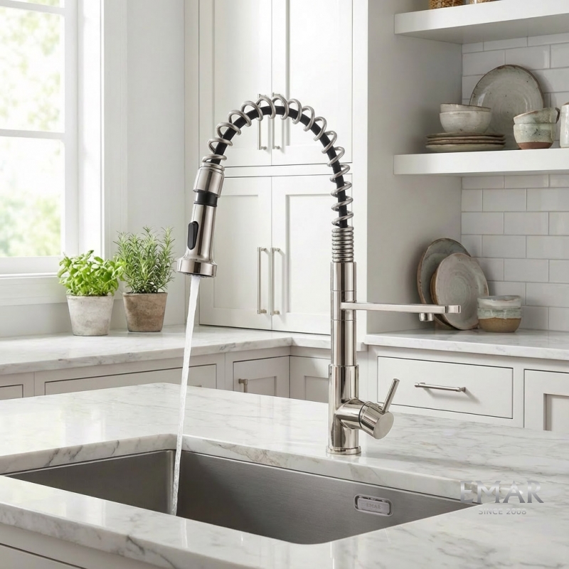 Выдвижной излив с магнитным фиксированием позволяет регулировать высоту смесителя, увеличивает площадь и эффективность использования. Дополнительной кнопкой расположенной на выдвижном изливе, возможно переключение режимов подачи воды – струя / душ. Соответствует стандартам DIN DVGW.