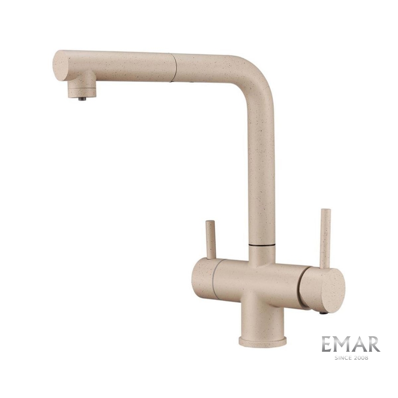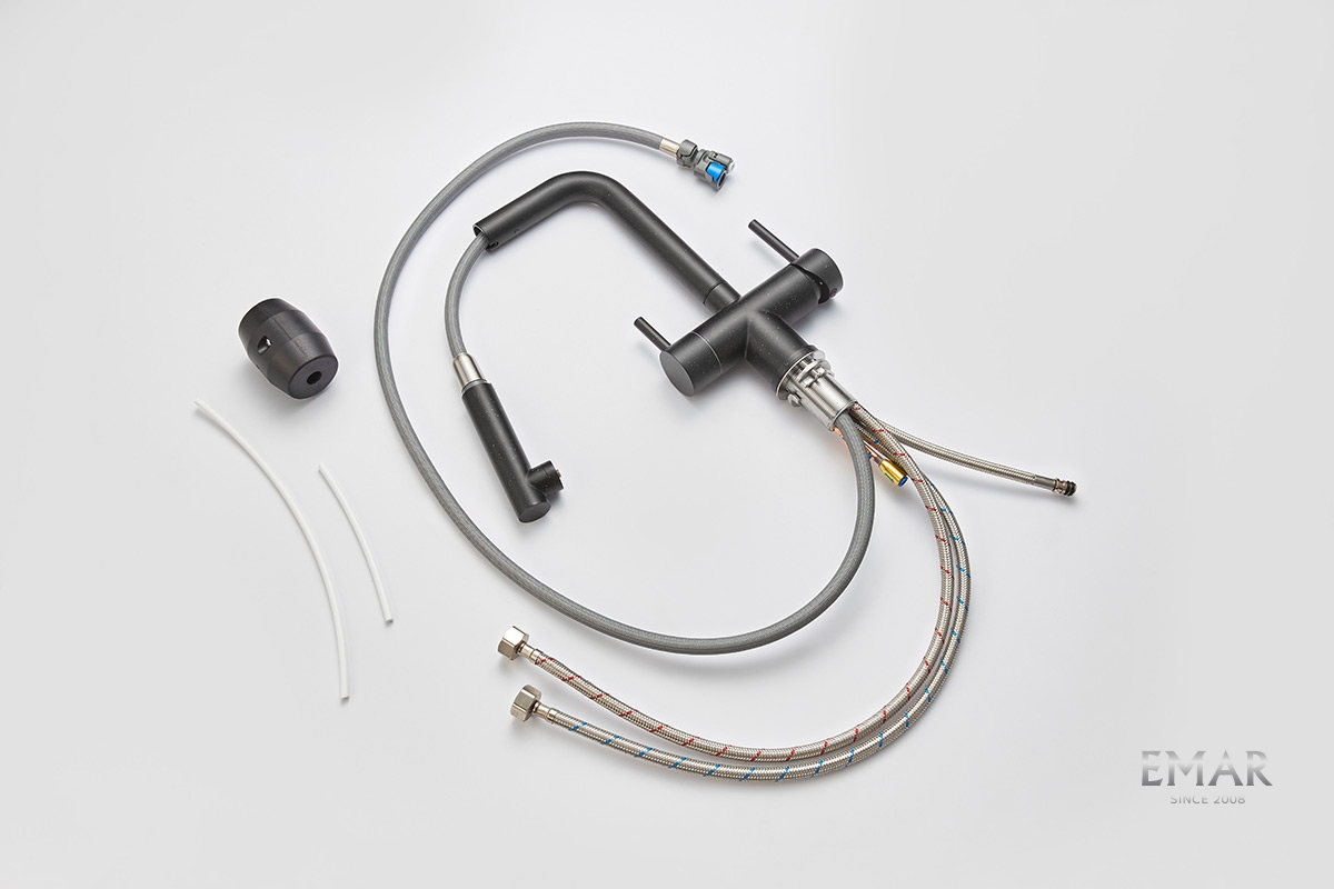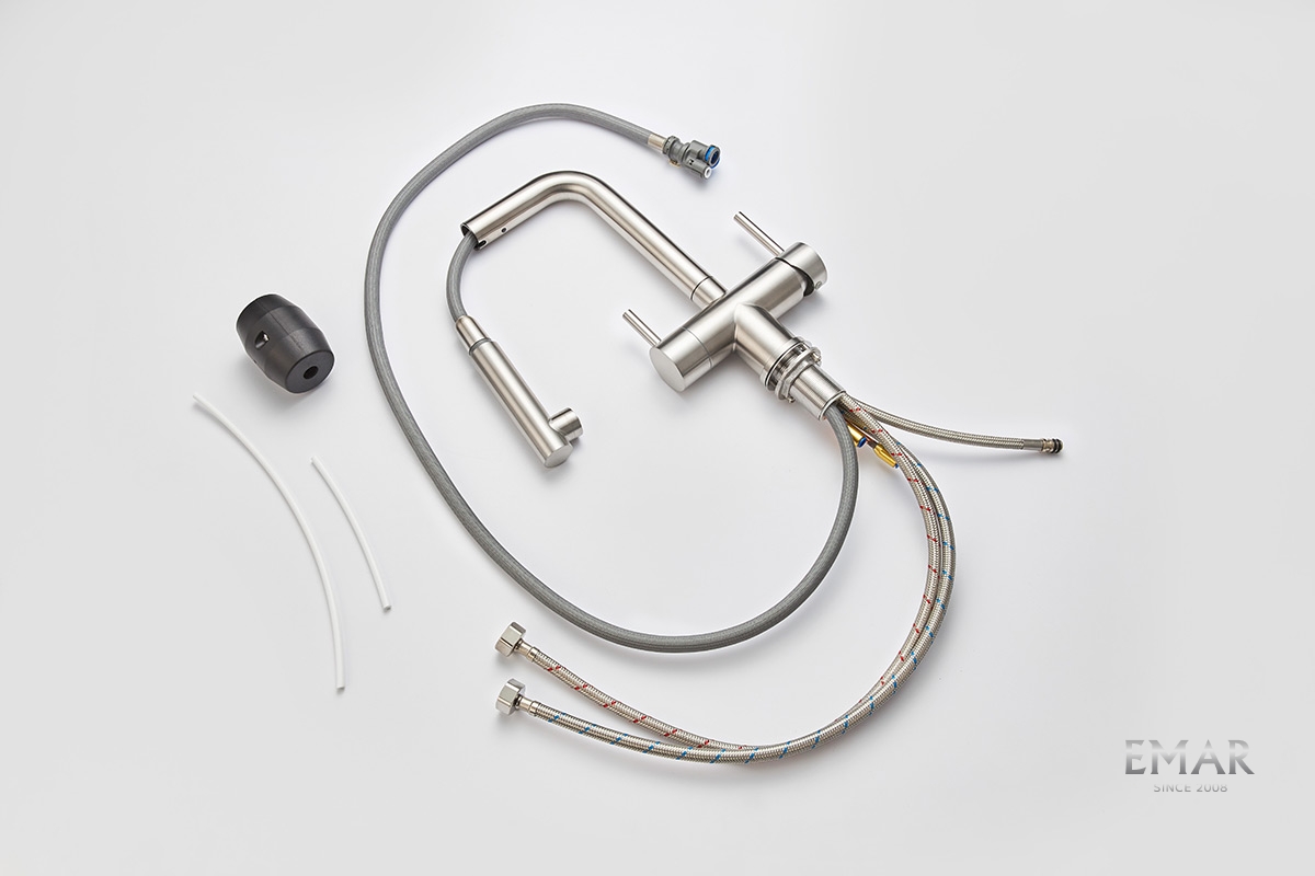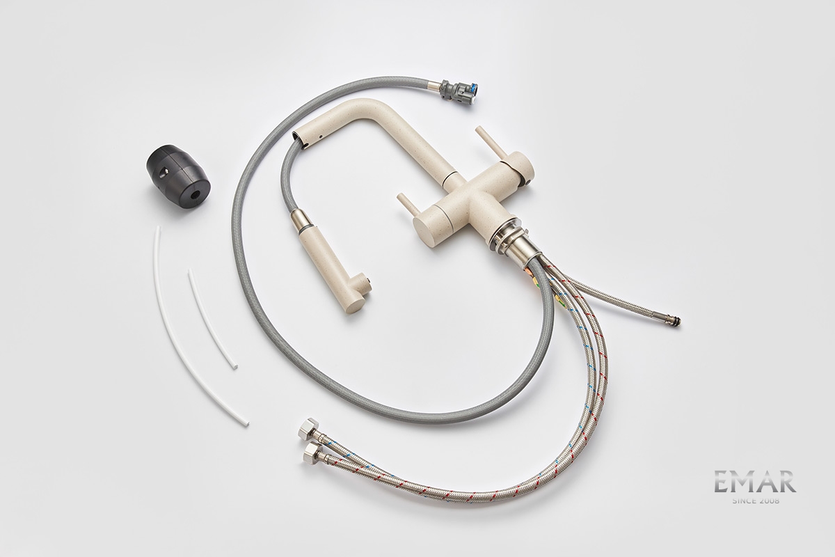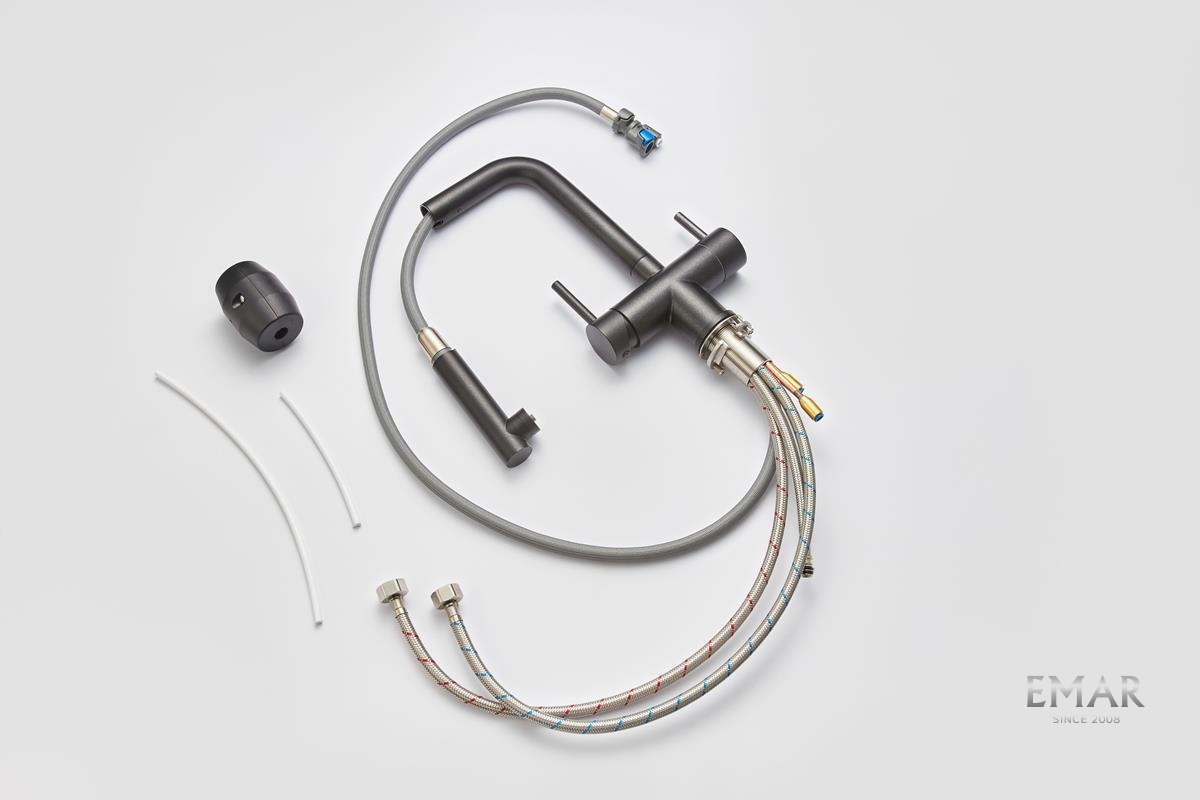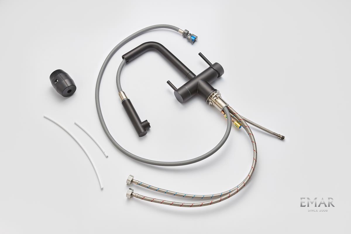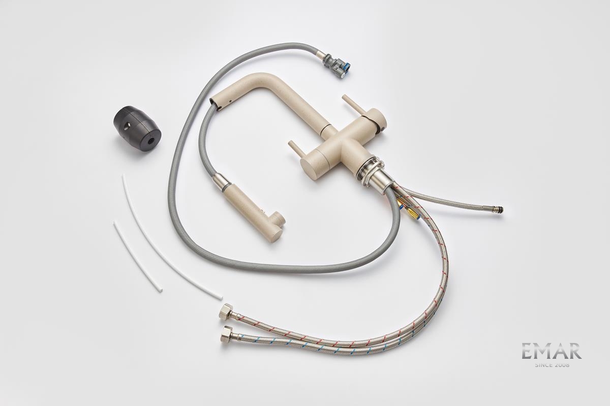 Кухонный смеситель с возможностью подключения фильтра для очистки воды. Фильтрованная вода подается отдельной ручкой через отдельную трубку и не смешивается с водопроводной водой.