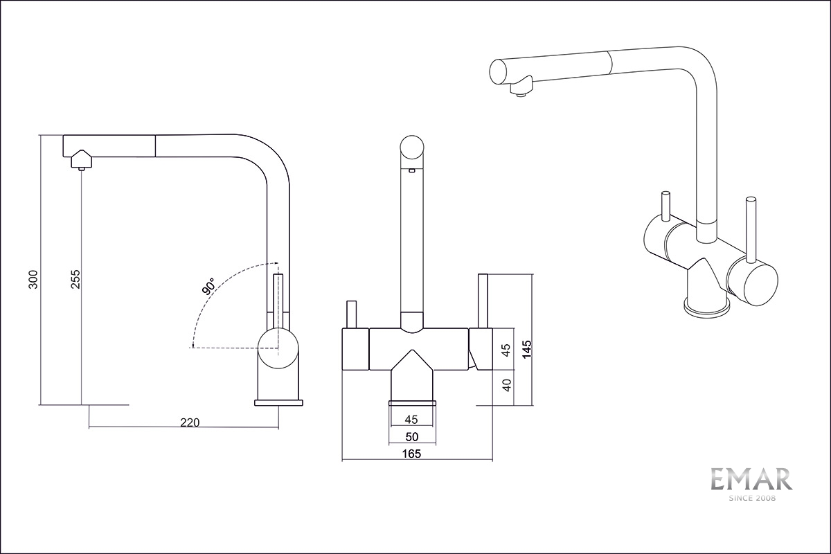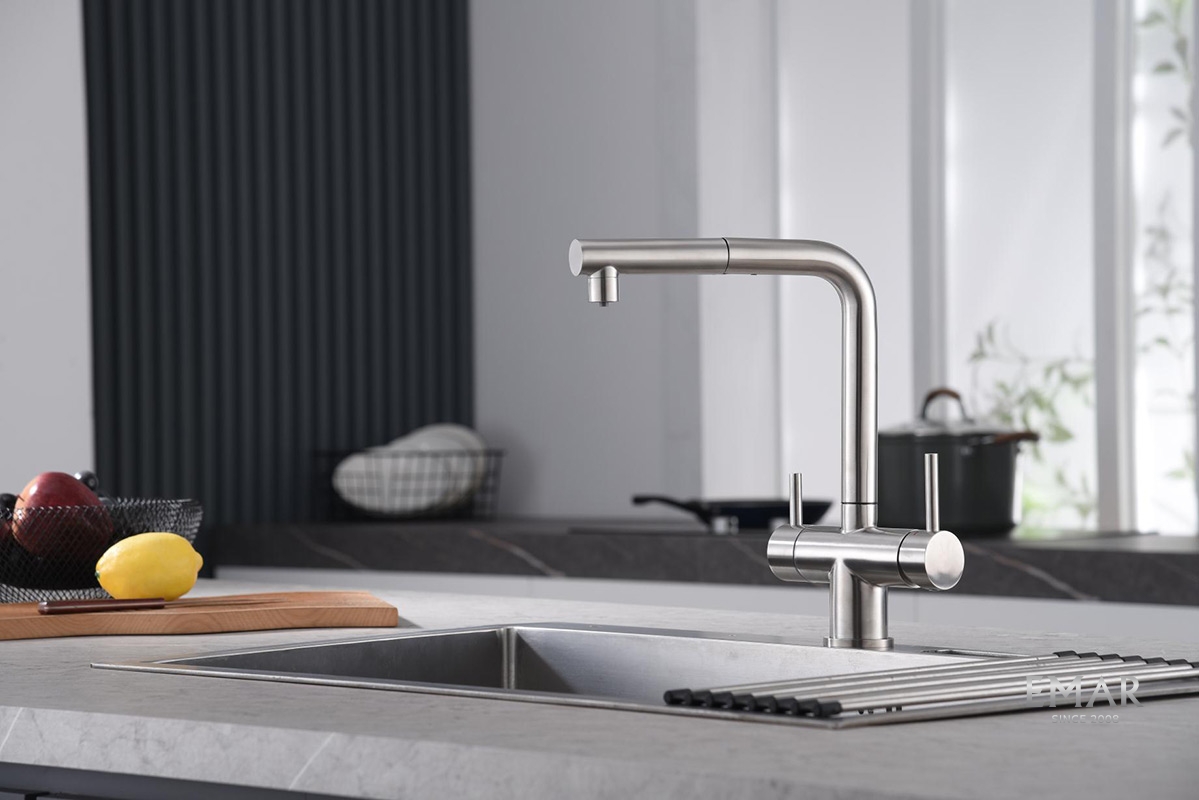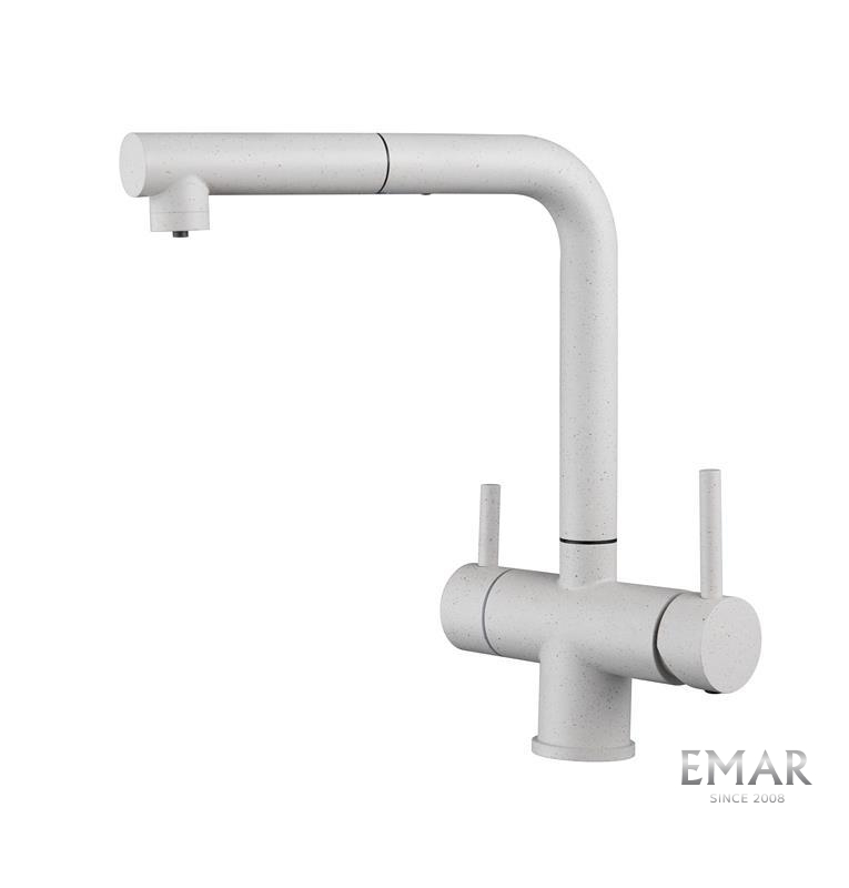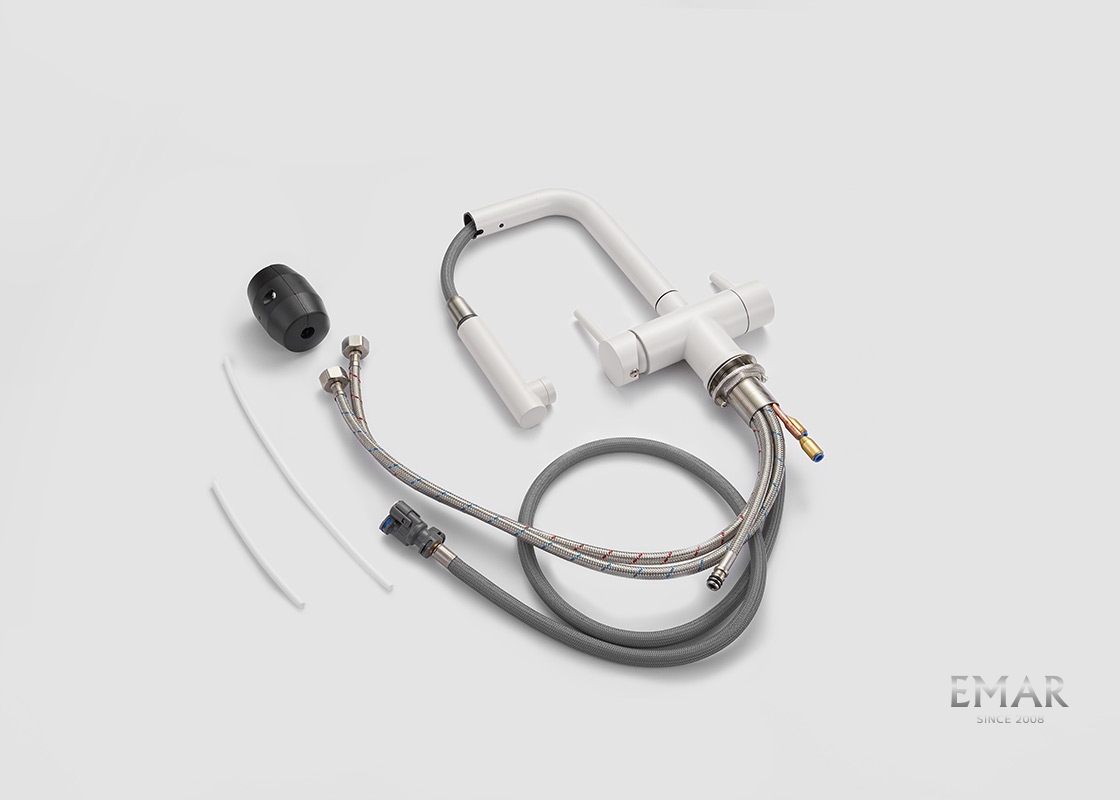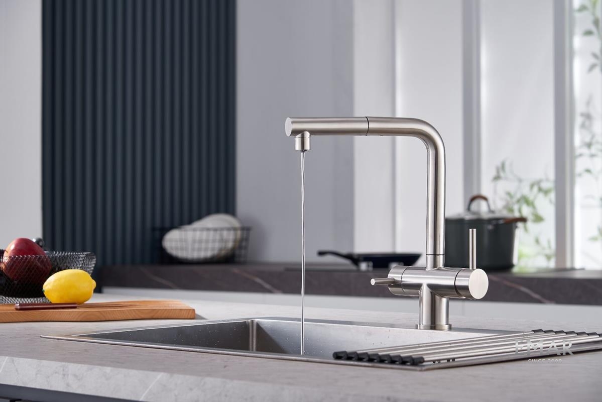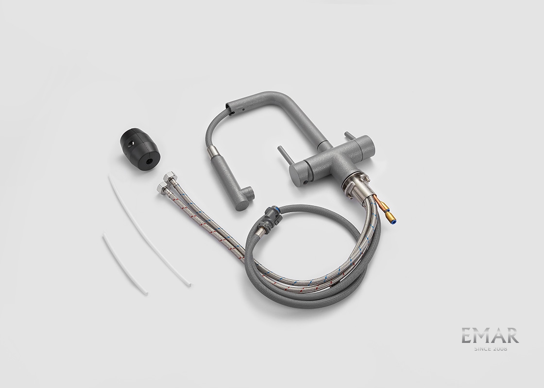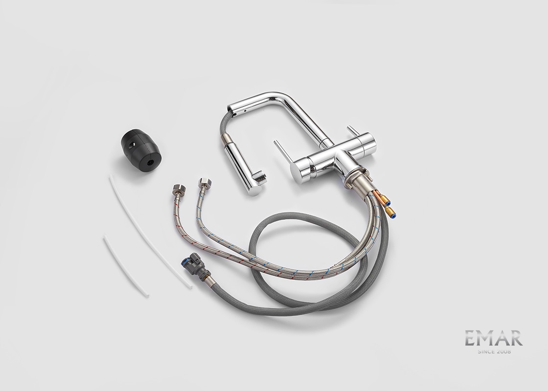Кухонный смеситель с возможностью подключения фильтра для очистки воды. Фильтрованная вода подается отдельной ручкой через отдельную трубку и не смешивается с водопроводной водой.
