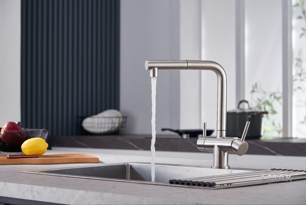 Однорычажное управление поможет легко регулировать температуру и напор подачи воды. Выдвижной излив увеличивает площадь и эффективность использования смесителя. Соответствует стандартам DIN DVGW.