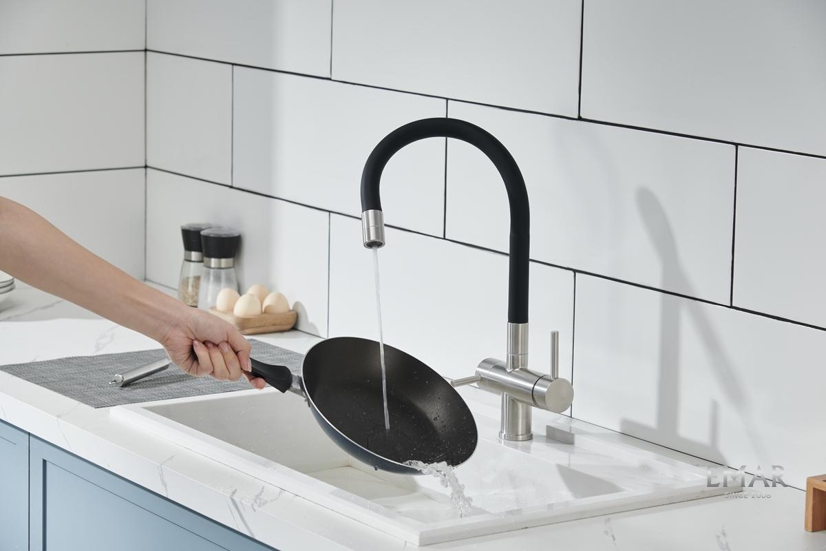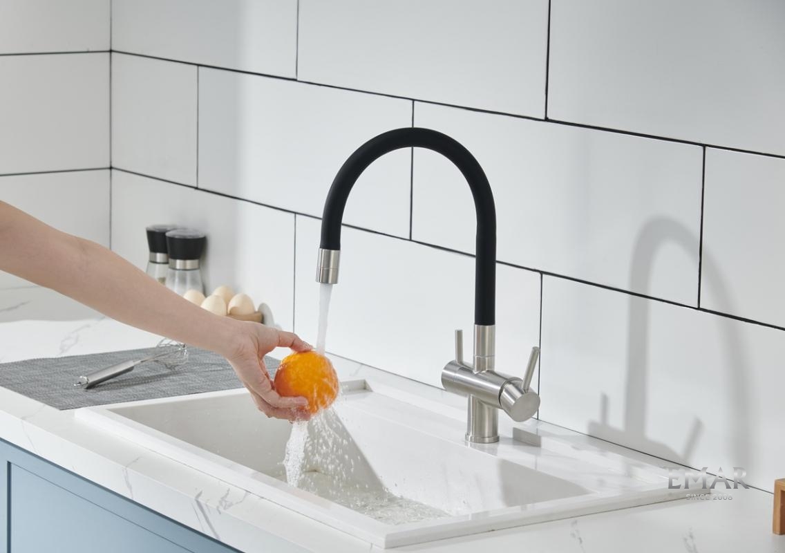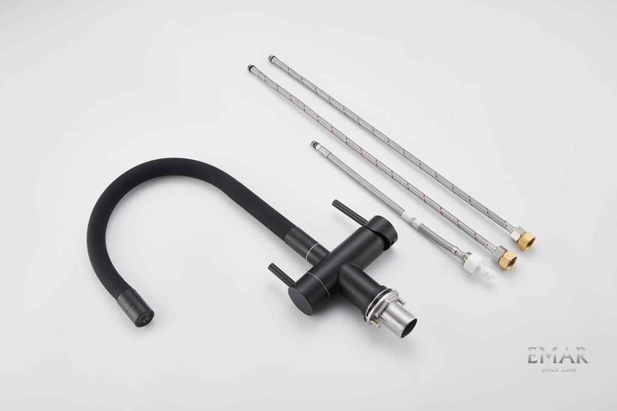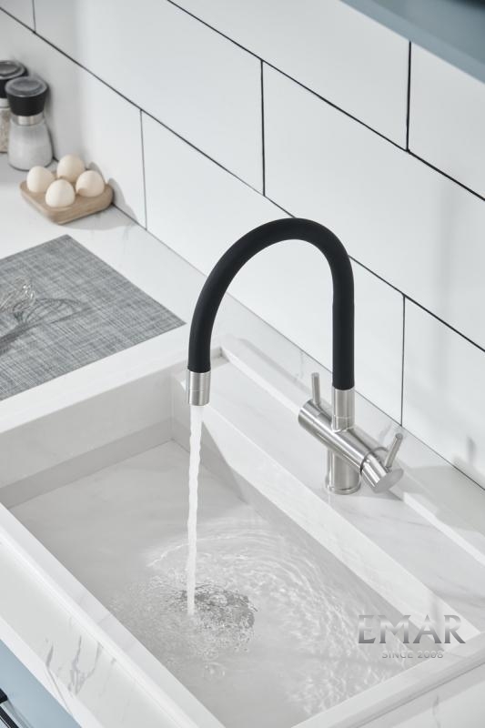 Кухонный смеситель с возможностью подключения фильтра для очистки воды. Фильтрованная вода подается отдельной ручкой через отдельную трубку и не смешивается с водопроводной водой. Однорычажное управление поможет легко регулировать температуру и напор подачи воды.