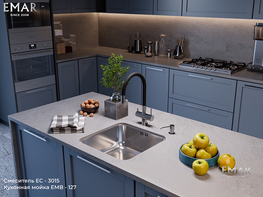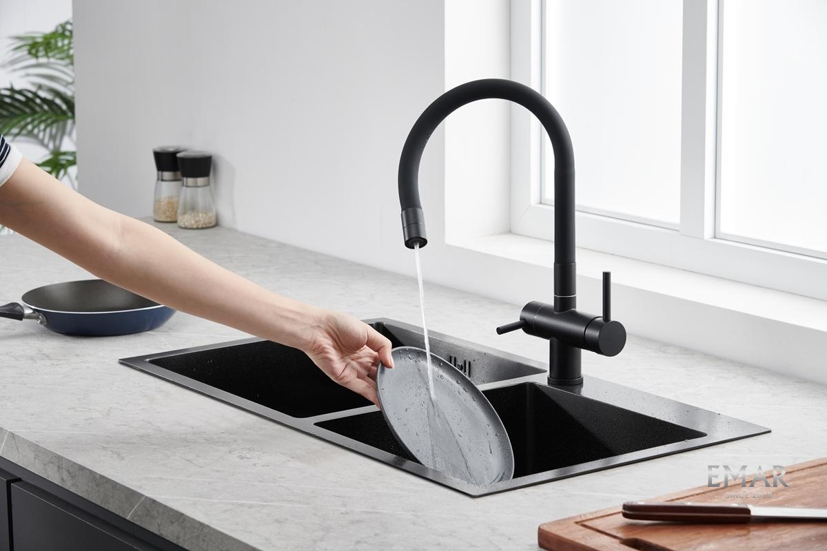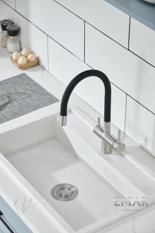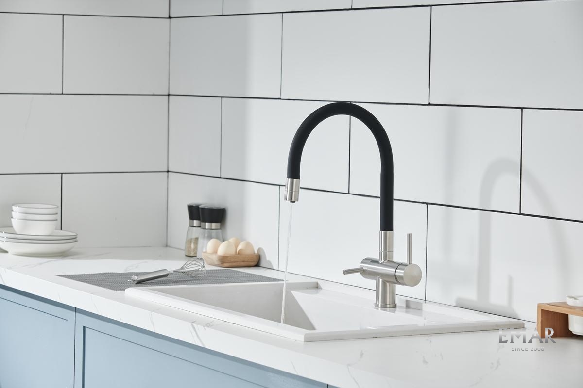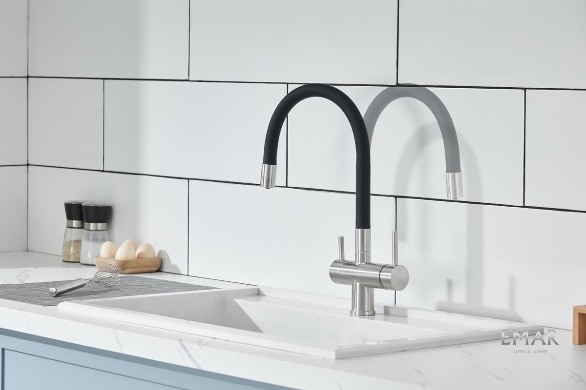 Кухонный смеситель с возможностью подключения фильтра для очистки воды. Фильтрованная вода подается отдельной ручкой через отдельную трубку и не смешивается с водопроводной водой. Однорычажное управление поможет легко регулировать температуру и напор подачи воды.