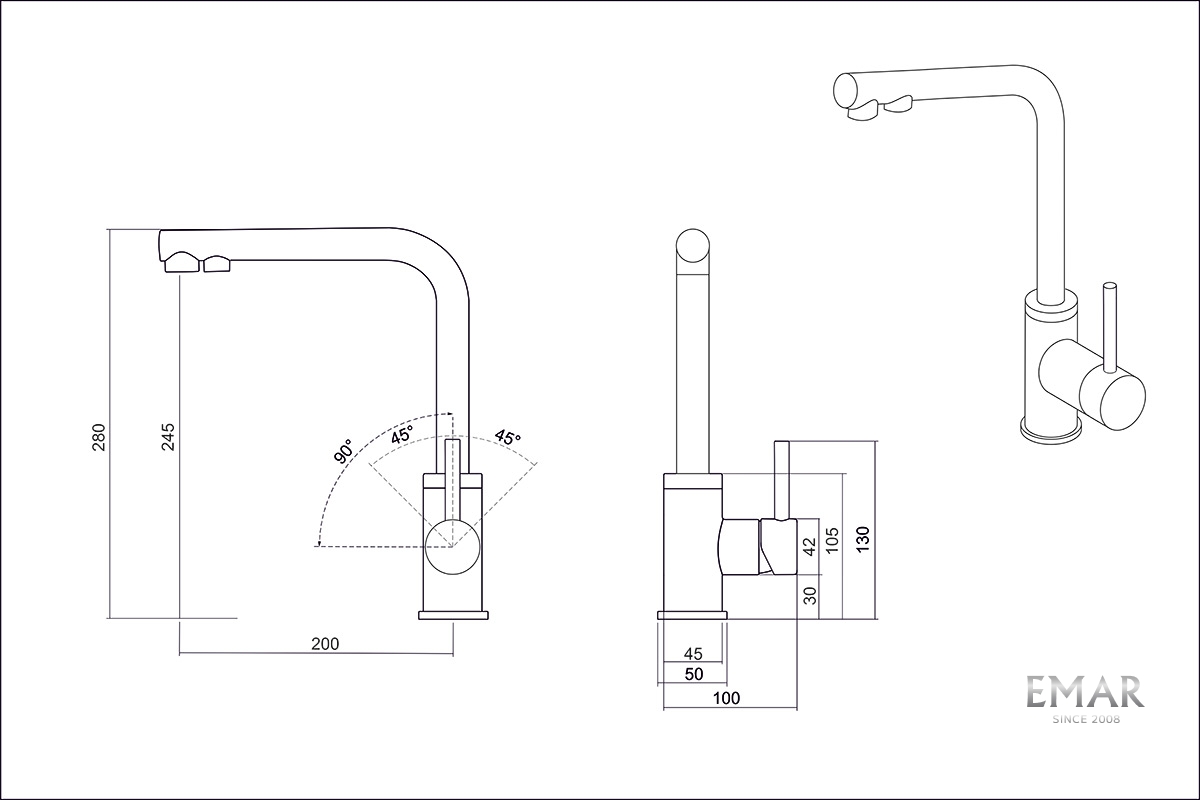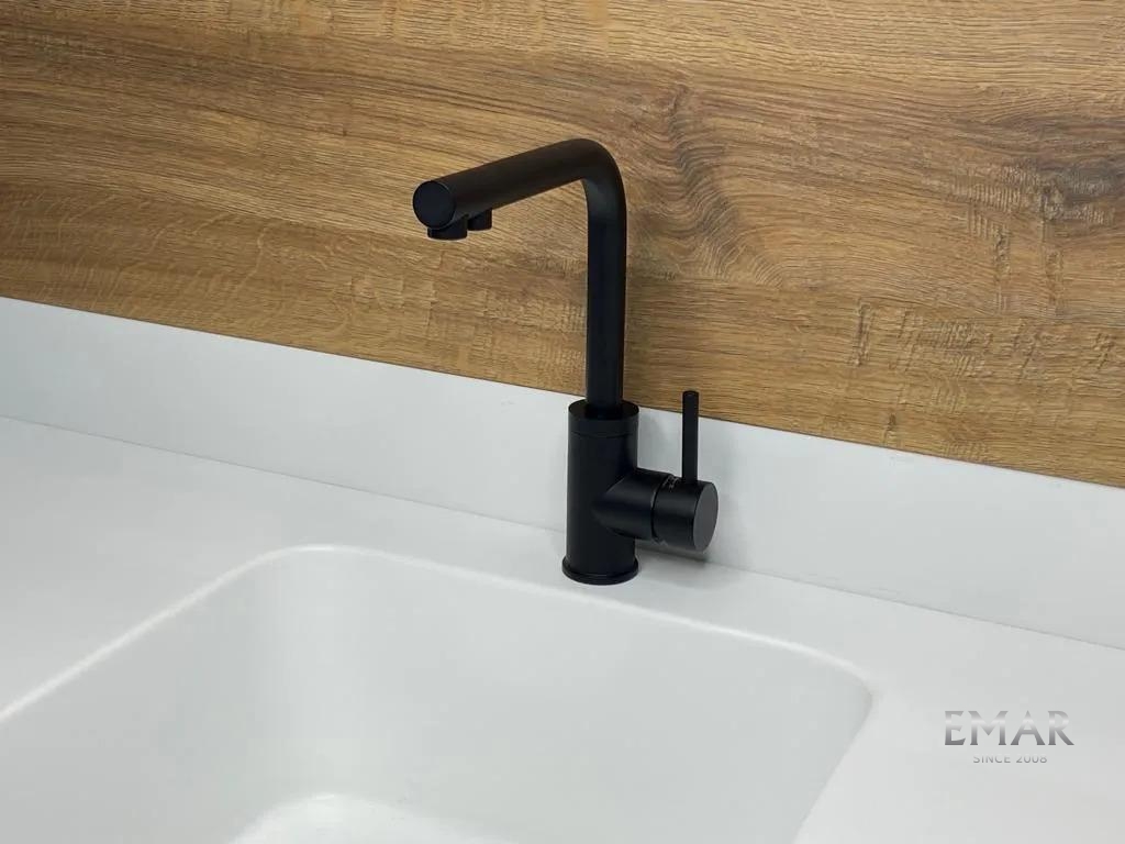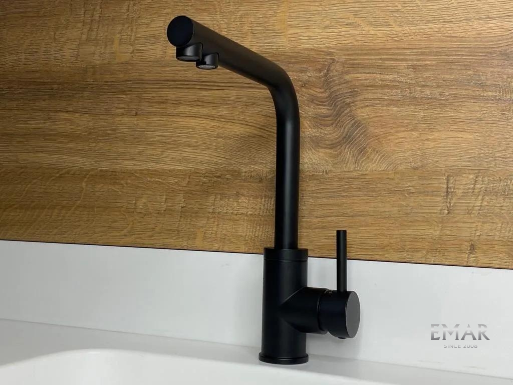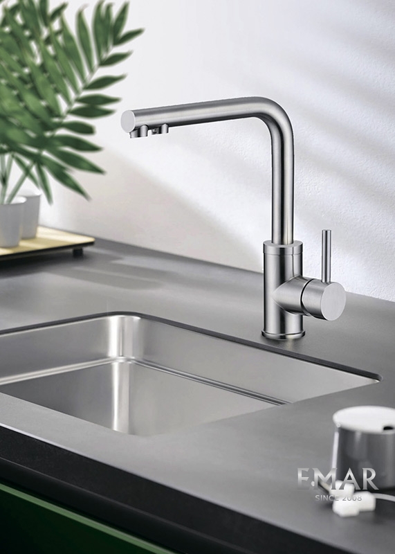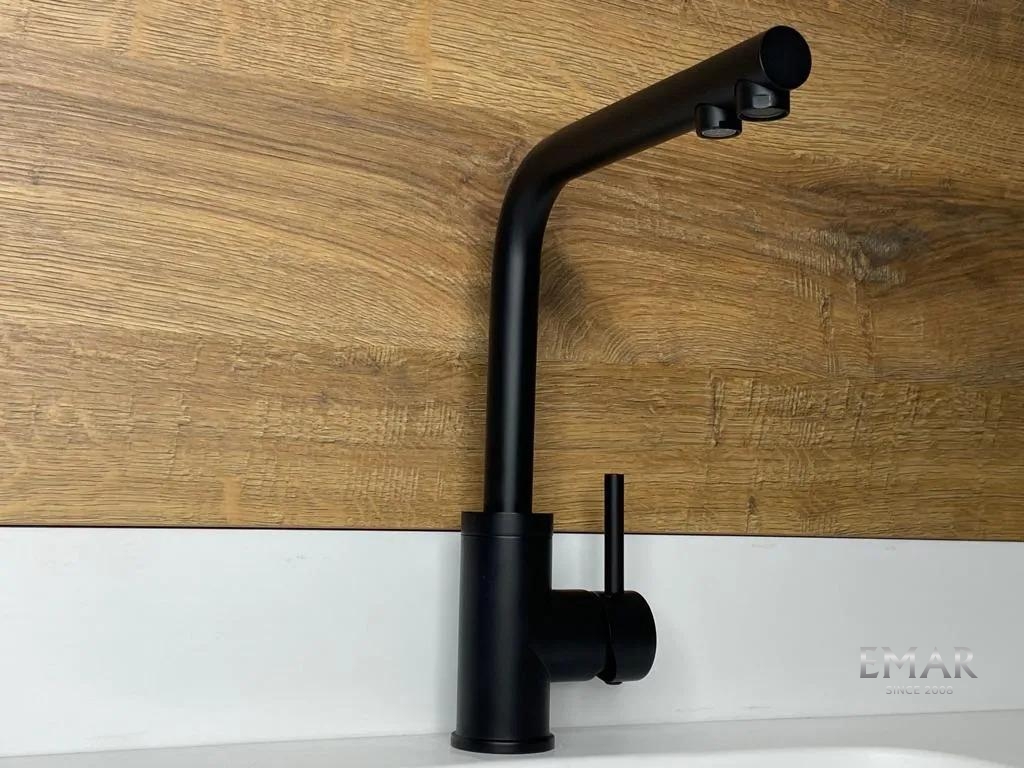 Кухонный смеситель с возможностью подключения фильтра для очистки воды. Фильтрованная вода подается через отдельную трубку и не смешивается с водопроводной водой. Однорычажное управление поможет легко регулировать температуру и напор подачи воды. Соответствует стандартам DIN DVGW.