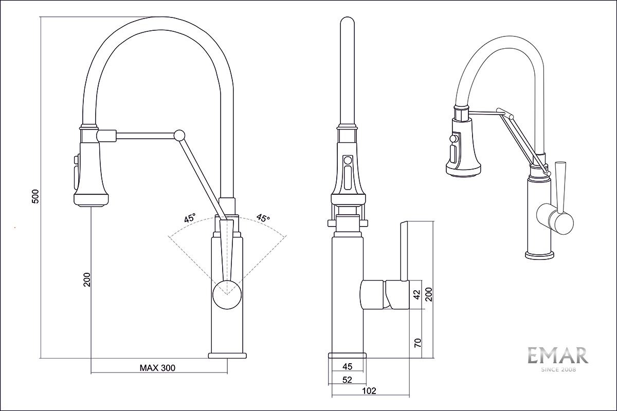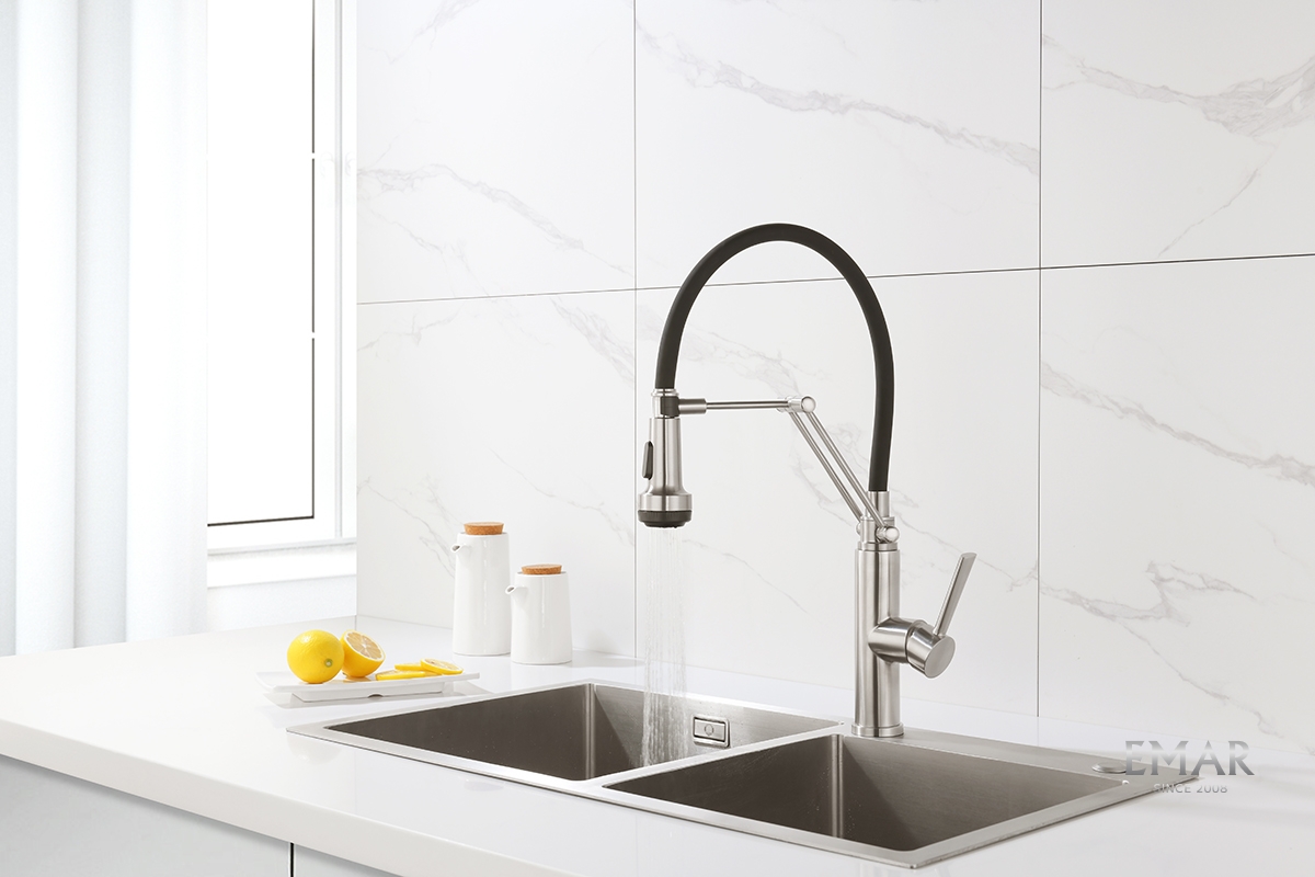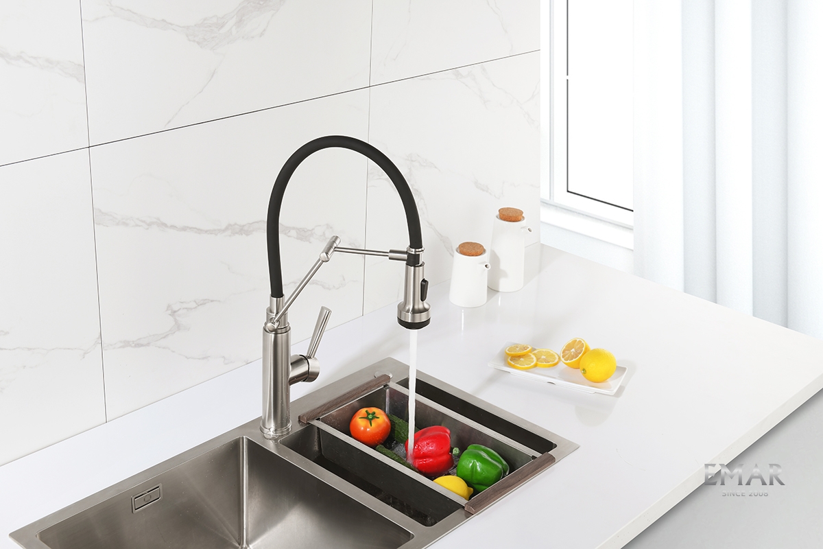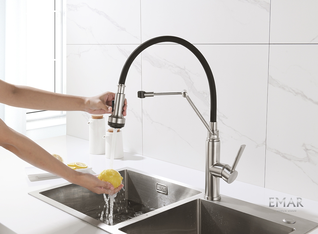 Кухонный смеситель с гибким изливом на телескопическом креплении. Телескопическое крепление позволяет регулировать направление и высоту струи. Однорычажное управление поможет легко регулировать температуру и напор подачи воды. Гибкий излив увеличивает площадь и эффективность использования смесителя.